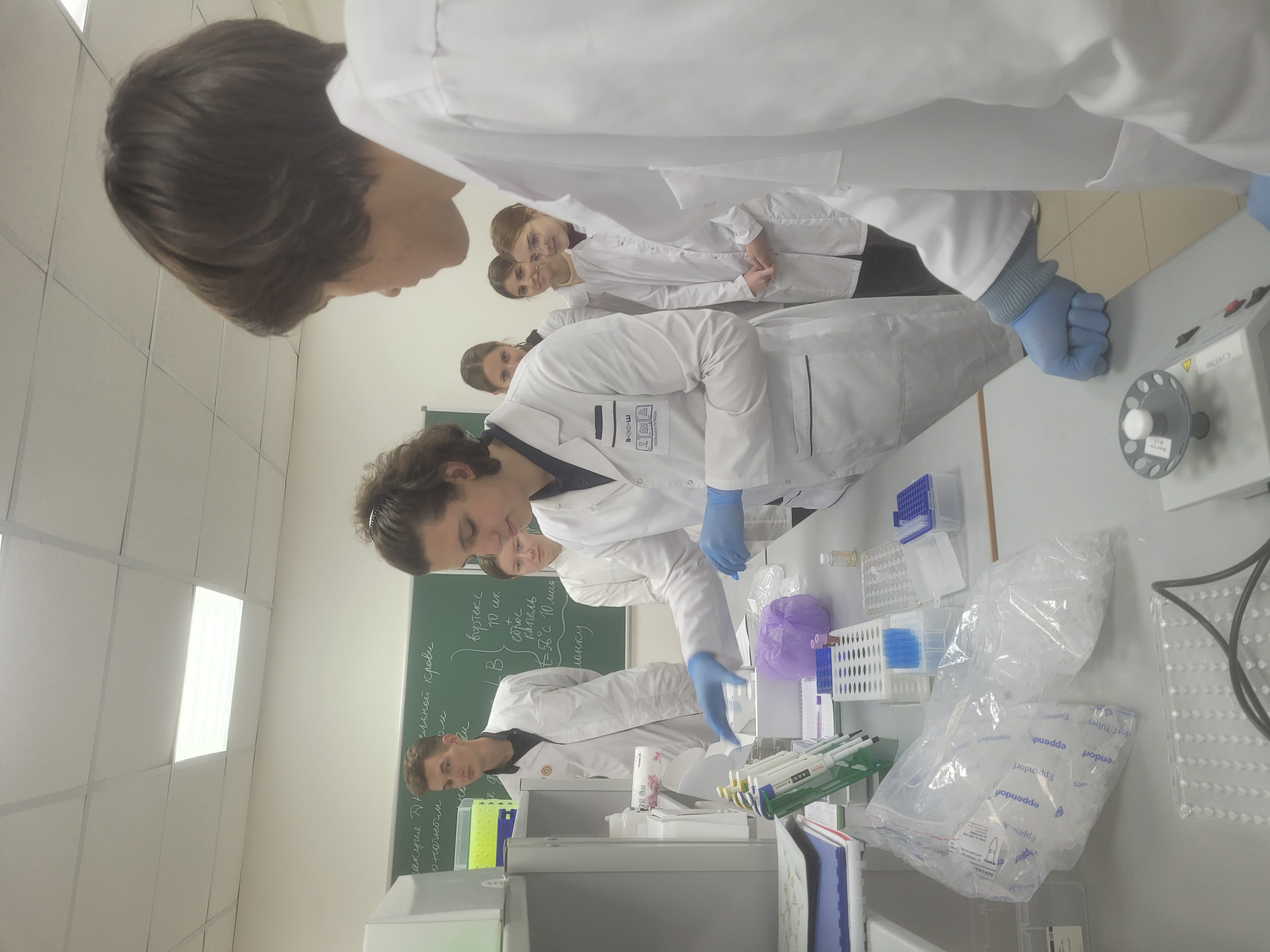 On October 7, 2025, a practical meeting of the student scientific society of the Department of Biological and Chemical Technology was held at the Research Institute of Genetic and Molecular Epidemiology on the topic "Biotechnological methods for extracting nucleic acids from biomaterial" under the leadership of Iuliia Eduardovna Azarova. The meeting began with a tour of the laboratories of the Research Institute of Genetic and Molecular Epidemiology, equipped with high-tech equipment for DNA extraction, analysis, and genotyping. The participants learned about the principles of laboratory space organization and the specifics of working with various types of biomaterial. The students also took part in practical work on DNA extraction from blood leukocytes using a column method using a domestic reagent kit from Nomotec. The principle of operation is based on cell lysis followed by DNA purification using microcentrifuge columns. Cell disruption, inactivation of cellular nucleases, and deproteinization occur during the first stage of isolation, when a mixture of "Solution 1B" and "Solution 2" is added to the tissue sample. In the presence of chaotropic substances contained in "Solution 1B" and "Solution 3B," DNA is adsorbed onto the membrane of a microcentrifuge column. The DNA is then washed to remove chaotropic substances and PCR-inhibitory impurities with "Solution 4B," after which it is eluted from the membrane with "Solution 5B." First-year students of the Faculty of Biotechnology, Artem Yuryevich Ivanov, Ilya Mikhailovich Parkhomenko, Makar Yuryevich Bykovsky, and Roxana Ashotovna Tumanyan, showed particular interest in the methodology. The students of biotechnological faculty measured the concentration and purity of the resulting DNA solutions: these parameters met quality control criteria, meaning the isolated DNA samples could be used for further genetic analysis. The student scientific society meeting became an important stage in the students' professional development, where they were able to immerse themselves in the atmosphere of real scientific research and gain valuable practical experience.