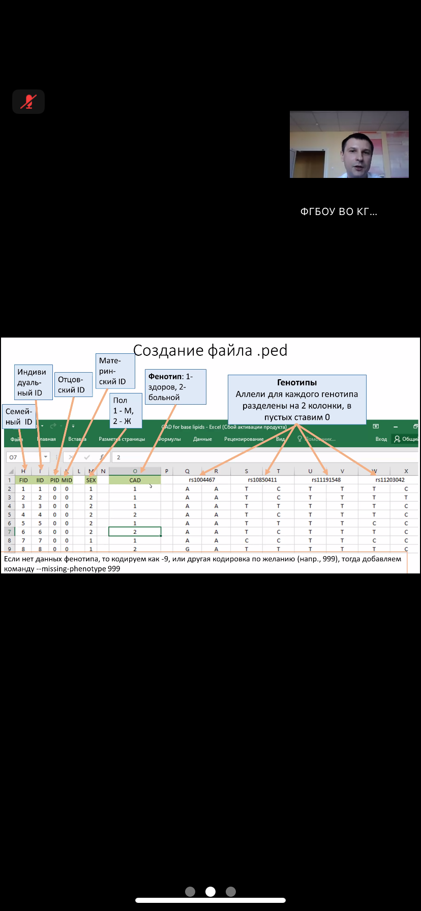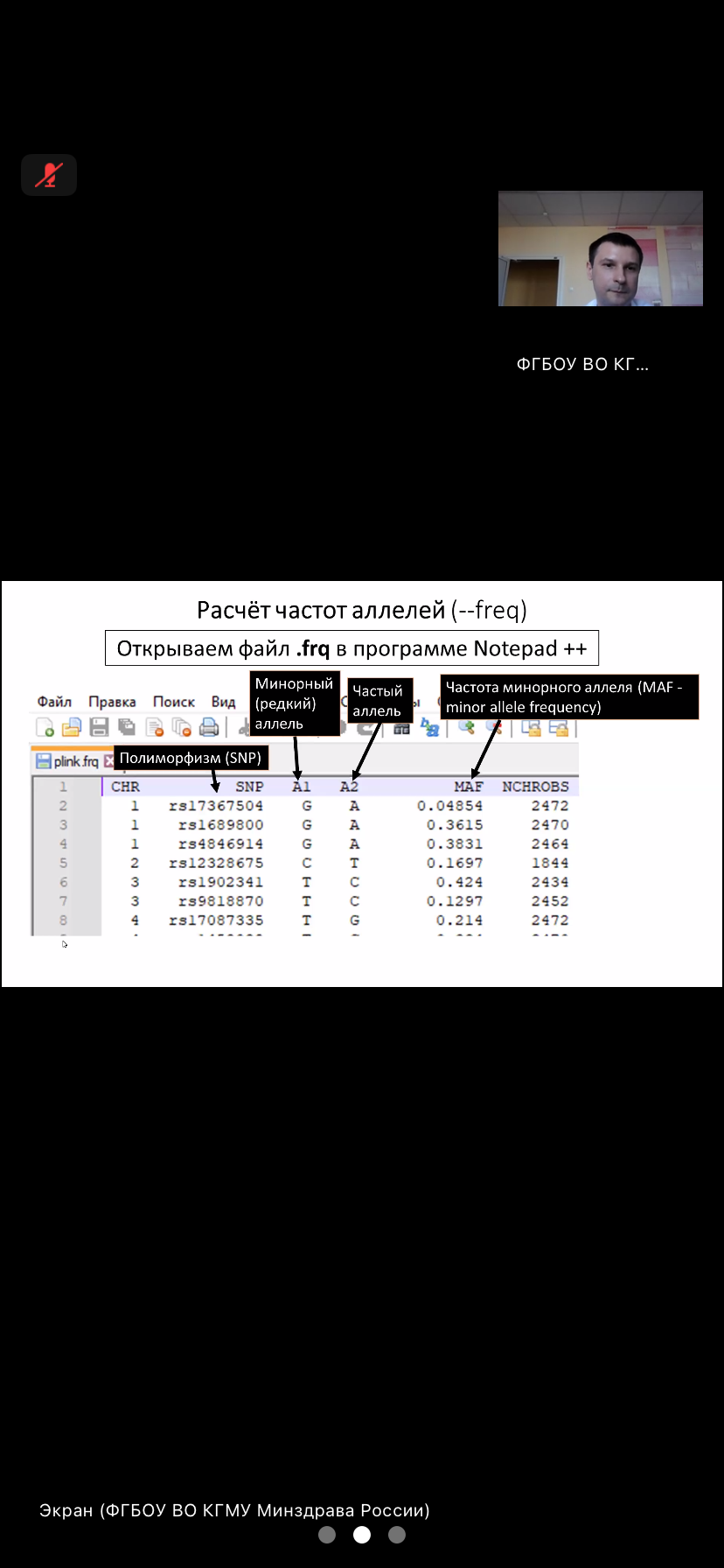 31 марта 2026 г. на кафедре биологии, медицинской генетики и экологии состоялось 3 заседание клуба «Генетика в медицине» в виде мастер-класса по работе с программой PLINK. Программа необходима для проведения генетико-статистических расчётов. Мастер – класс был организован Научно-исследовательским институтом генетической и молекулярной эпидемиологии (НИИ ГМЭ). Возглавляет Научно-исследовательский институт генетической и молекулярной эпидемиологии д.м.н., профессор Алексей Валерьевич Полоников. Мастер - класс провел Кононов Станислав Игоревич, к.м.н., соискатель НИИ ГМЭ, ассистент кафедры внутренних болезней №2. Кононов Станислав Игоревич в доступной форме изложил основные возможности данной программы. Программа PLINK позволяет хранить и конвертировать данные генотипирования, используя программу можно проводить анализ популяций, определение родства, возможность работать с большими объемами данных – до нескольких сотен тысяч маркеров. Программа PLINK дает возможность оценивать риски развития заболеваний, риски осложнений, выбирать тактику диагностики и профилактики. Студенты 1 курса лечебного и педиатрического факультетов проявили большой интерес к программе PLINK как источнику новых знаний в рамках молекулярной генетики и новых возможностей.