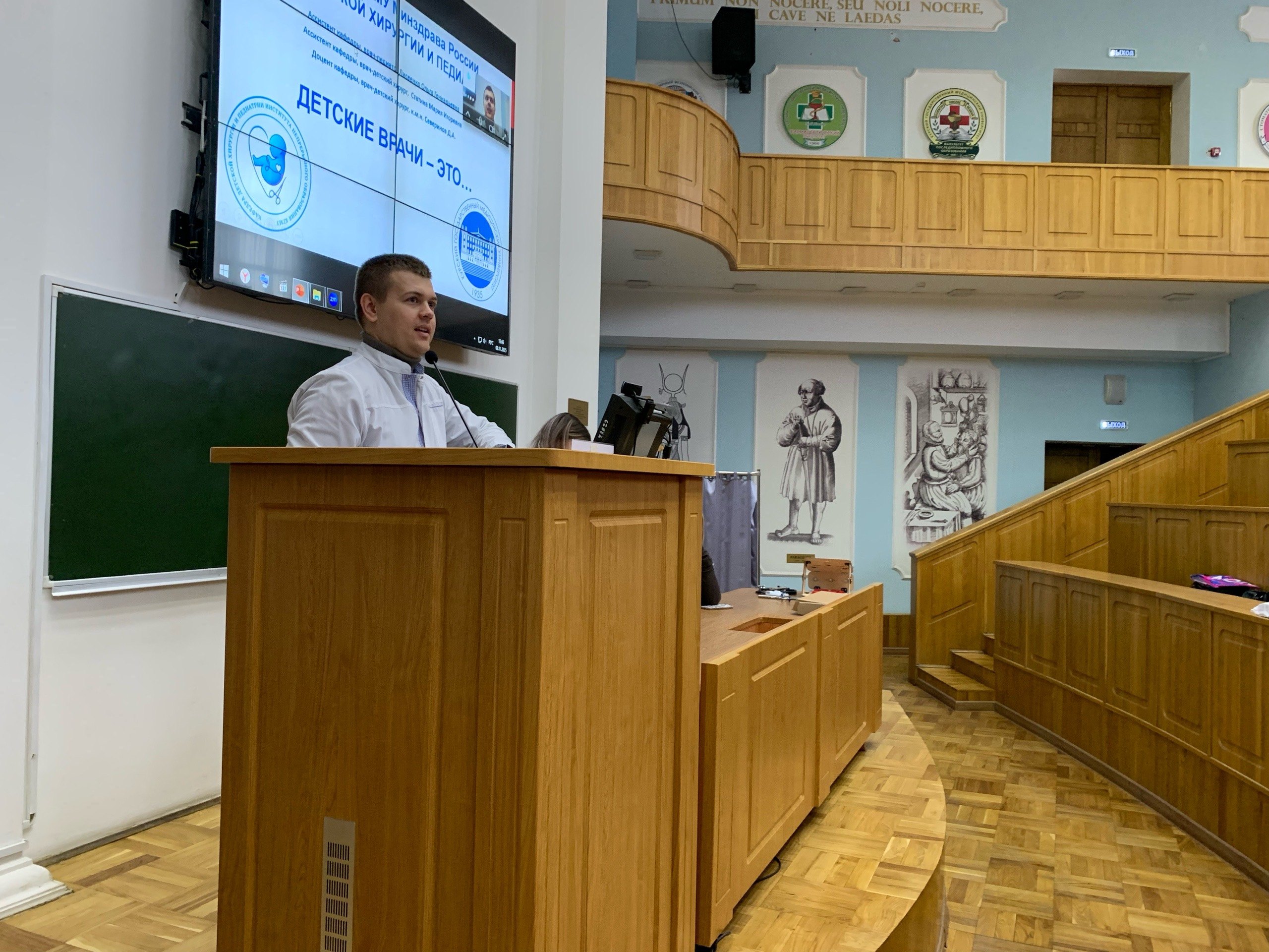 Затем выступили преподаватели кафедры детской хирургии и педиатрии ИНО КГМУ (зав кафедрой, д.м.н., доцент В.П. Гаврилюк). Ассистент кафедры, врач-педиатр Лисеенко О.Г. рассказала о тонкостях работы в педиатрии, а руководитель СНК по детской хирургии, к.м.н., доцент кафедры Северинов Д.А. и ассистент кафедры, врач-детский хирург Статина М.И. рассказали о профессии врача-детского хирурга и перспективах профессионального развития в данной сфере.
