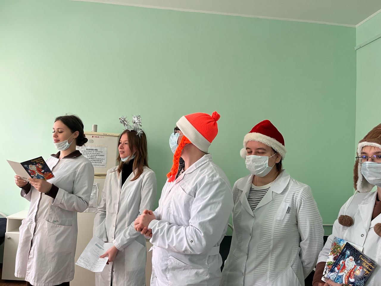 В канун Нового года, студенты 23 группы 4 курса лечебного факультета, находясь на занятиях цикла дерматовенерологии, поздравили с наступающим праздником пациентов стационарного отделения областного кожновенерологического диспансера.