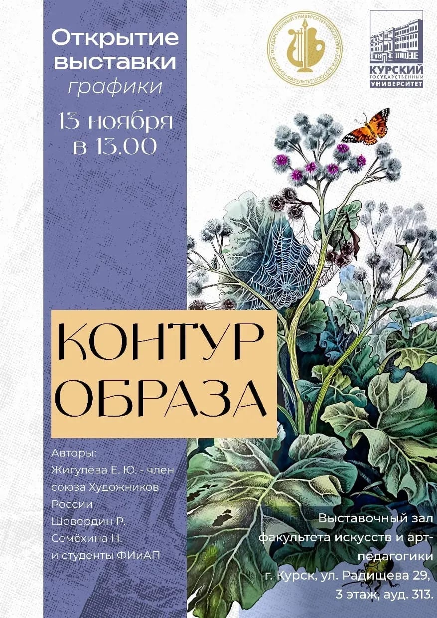 Торжественное открытие выставки « Контур образа» состоялось 13 ноября 2025 года в выставочном зале кафедры изобразительного искусства и арт-педагогики Курского государственного университета при участии представителей от руководства университета, преподавателей и студентов, почетных гостей из учебных заведений города Курска и курского региона, а также почетных гостей областных и городских организаций. Выставка посвящена роли “Ее Величества” прекрасной графике – линогравюре в изобразительном искусстве, как особому виду техники в многообразии существующих техник.