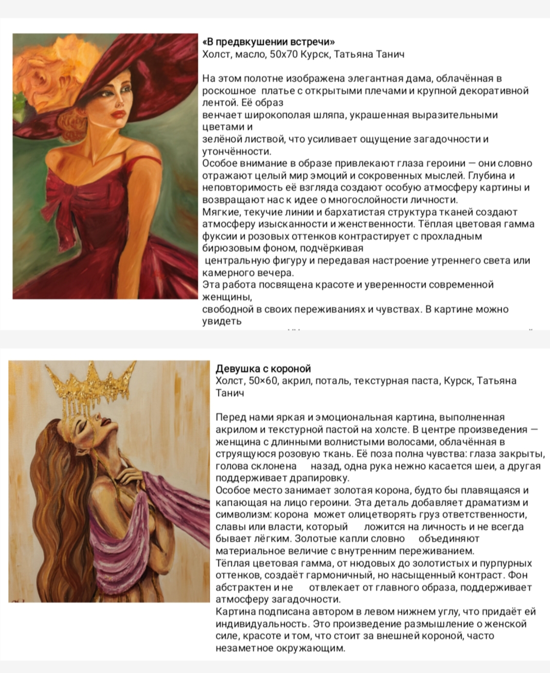 В Областной библиотеке им. Н.Асеева состоялась авторская выставка картин художника-любителя Татьяны Танич. Выставка называется «Художник, который не только пишет картины, но и лечит». Такое название выбрано не случайно, т.к. автор выставки по образованию врач, выпускница Первого Московского государственного медицинского университета им. И.М.Сеченова. Студенты Курского государственного медицинского университета 2 курса лечебного факультета, посетившие данную выставку, оставили свой отзыв в книге для посетителей.