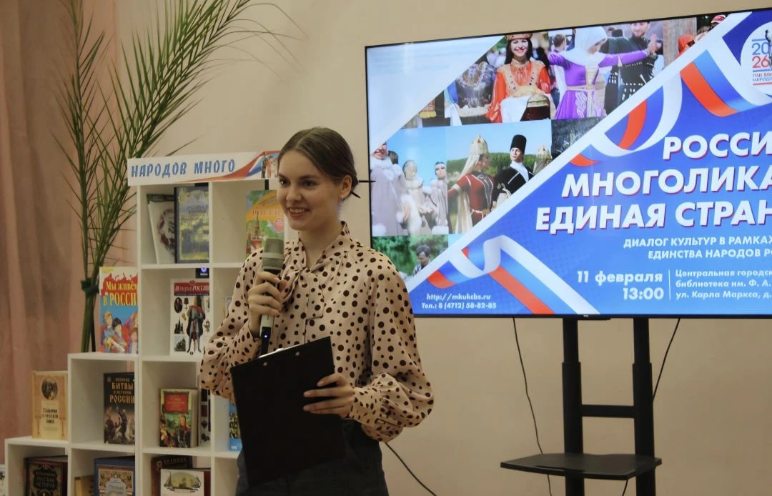В прошедшую среду, 11 февраля 2026 года, Разинькова Екатерина — староста студенческого научного кружка кафедры общей и биоорганической химии — по приглашению организаторов выступила на открытом культурном мероприятии «Россия – многоликая, единая страна!» в Центральной городской библиотеке им. Ф.А. Семенова, посвященном Году единства народов России.