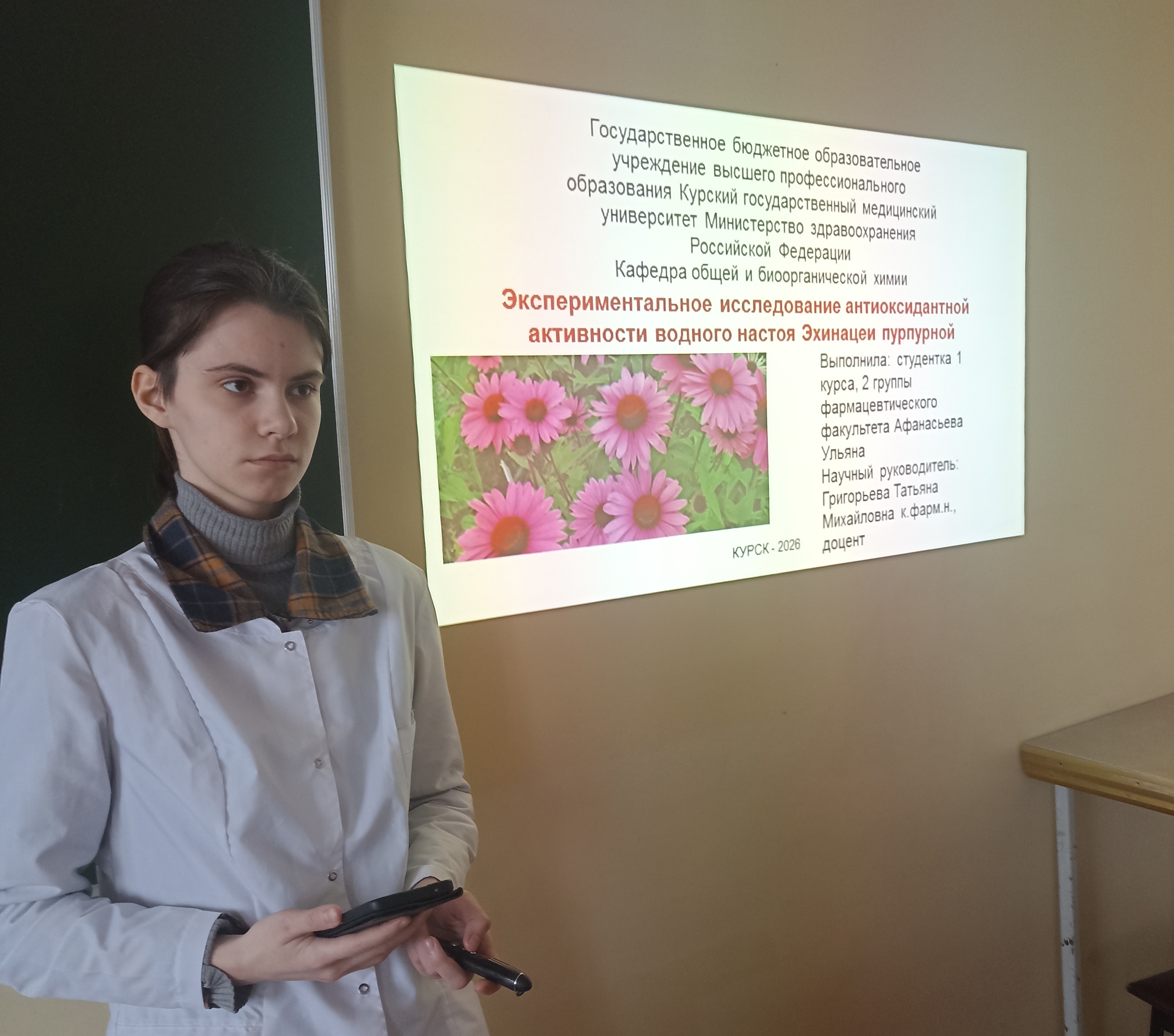 At the meeting, 1st-year students of the 2nd group of the Faculty of Pharmacy Zamarueva Julia and Afanasyeva Ulyana presented reports on the results of their experimental work: they determined the antioxidant activity of the drug and aqueous extracts of medicinal plant raw materials using the chemiluminescent method.