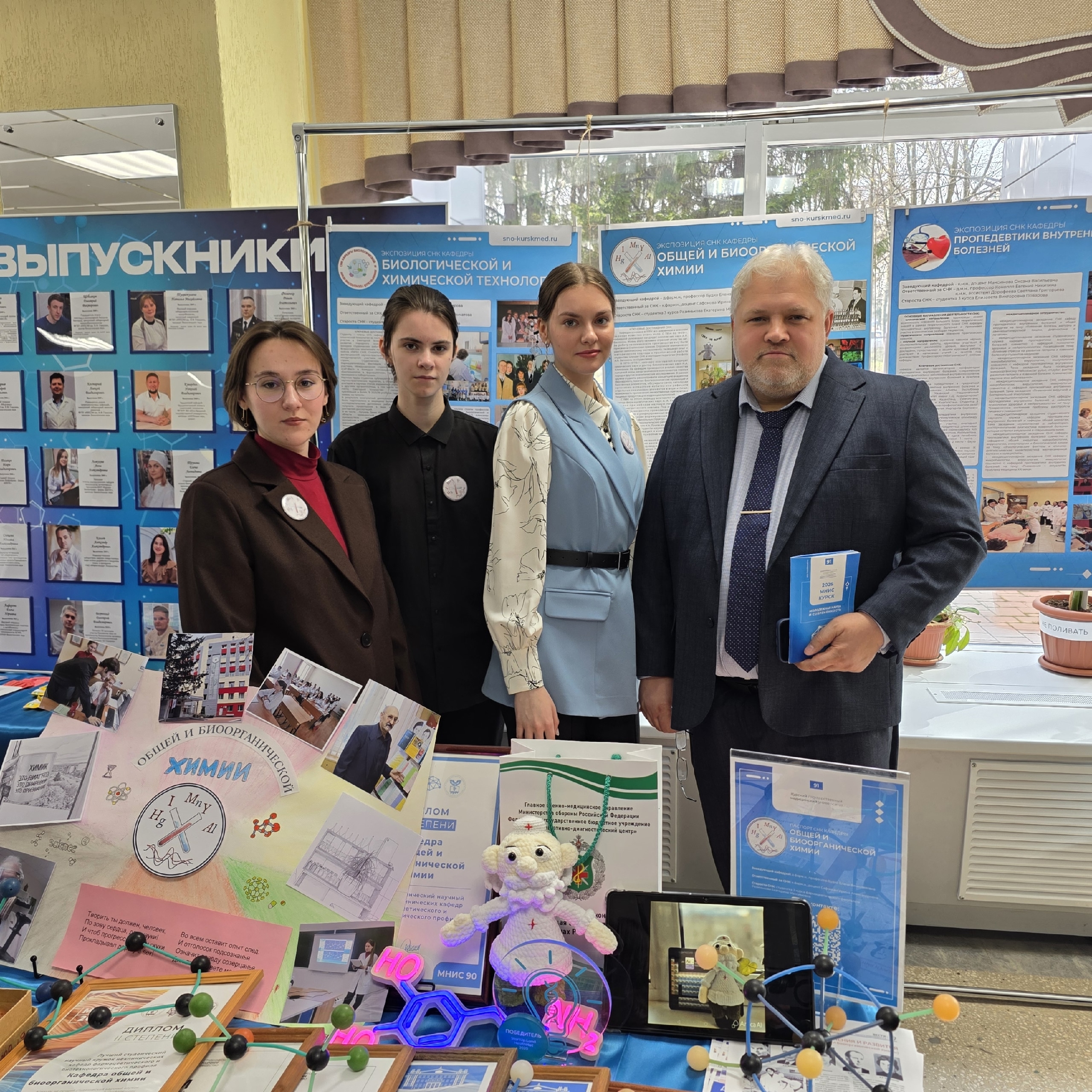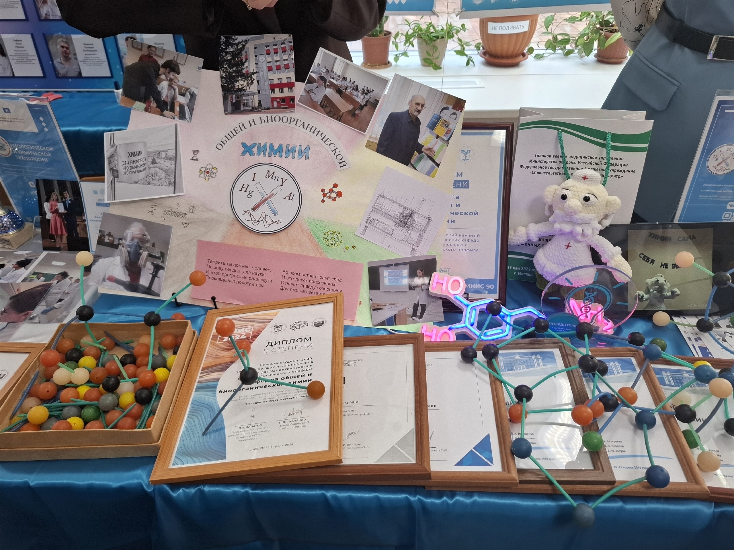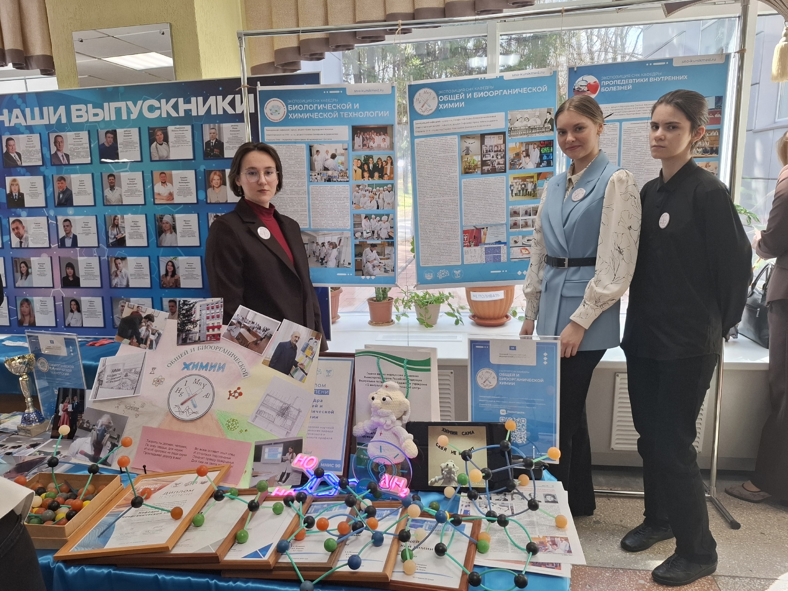 Кружок кафедры общей и биоорганической химии представляли староста Разинькова Екатерина (студентка 3 курса фармацевтического факультета) и активистки СНК Праведникова Татьяна и Афанасьева Ульяна (студентки 2 и 1 курса фармацевтического факультета). Студентки рассказывали гостям выставки историю кафедры, обновленную к празднованию юбилея – 90-летия, проводили интересные интерактивы, а несравненный дух кафедральный завлекал своей милой уникальностью. На выставке были представлены новейшие достижения СНК, некоторые продукты разработки ученых кафедры совместно со студентами, а также большой плакат, показывающий любовь кружковцев к своей кафедре. Плакат подготовили студенты 3 курса фармацевтического факультета Кузнецова Алиса, Сенченко Николай, Разинькова Екатерина.