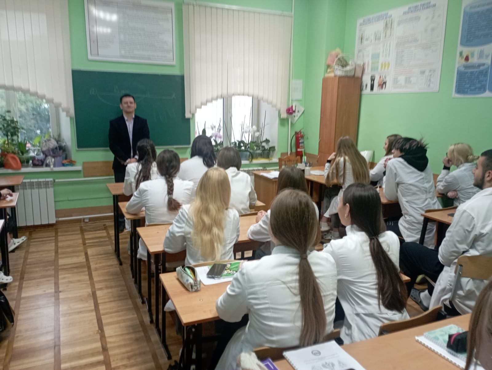В рамках профессионально-трудового воспитания для студентов первого курса медико-профилактического факультета прошло очередное мероприятие. 2 октября 2025 года состоялась встреча с заведующим консультационным центром ФБУЗ «Центр гигиены и эпидемиологии в Курской области» Быковым М.В.