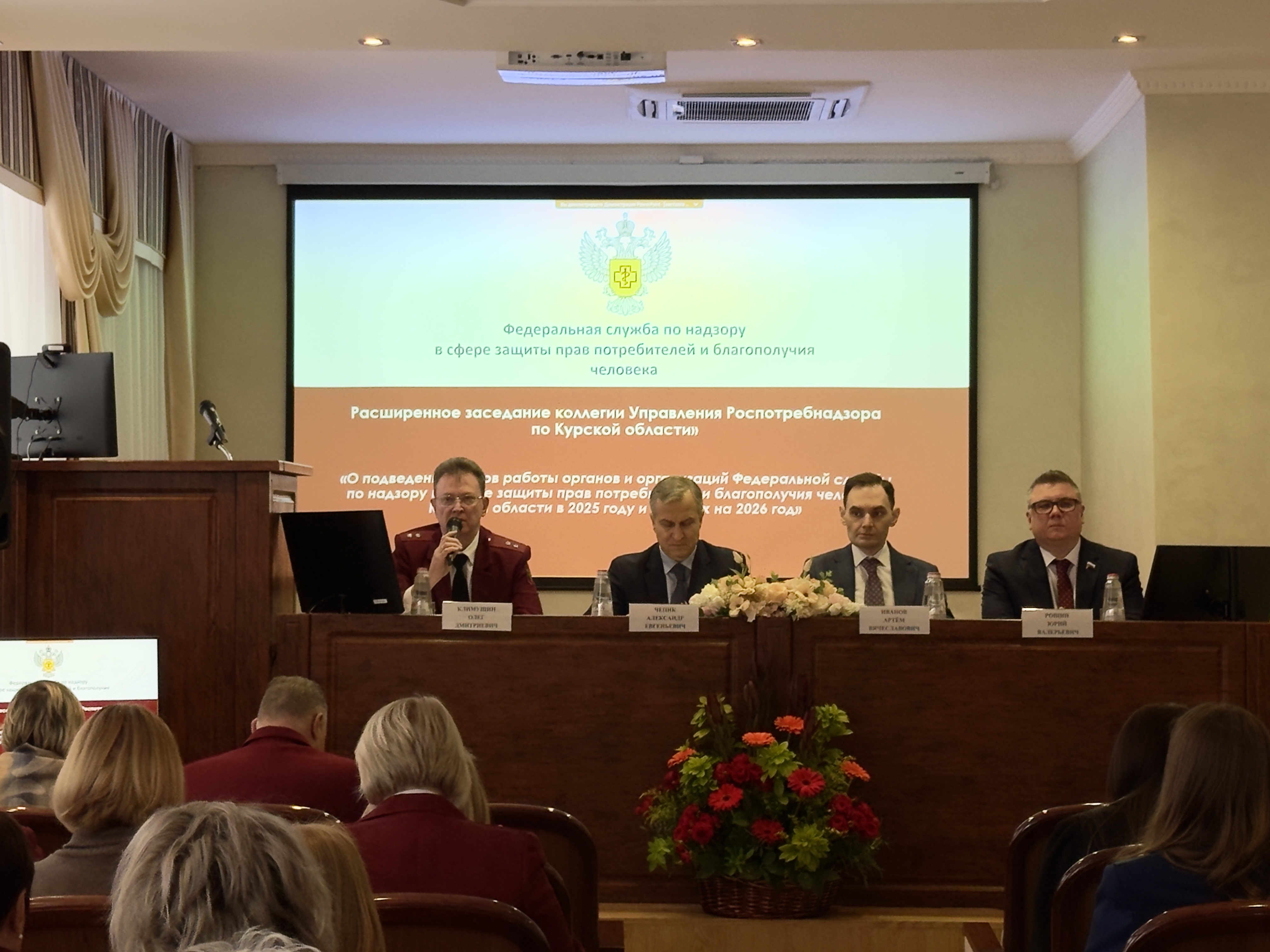 20 февраля 2026 г. состоялось расширенное заседание Коллегии Управления Федеральной службы по надзору в сфере защиты прав потребителей и благополучия человека по Курской области. В заседании коллегии приняли участие исполняющий обязанности губернатора Курской области А. Е. Чепик, исполняющий обязанности главного федерального инспектора по Курской области А. В. Иванов, член постоянного комитета по социальной, семейной политике и здравоохранению Курской областной Думы Ю.В. Рощин, главный врач ФБУЗ «Центр гигиены и эпидемиологии в Курской области» М.Л. Ковальчук, представители министерства здравоохранения Курской области, прокуратуры Курской области и других заинтересованных ведомств и организаций. КГМУ представляла заведующая кафедрой общей гигиены доцент Шепелева О.М.