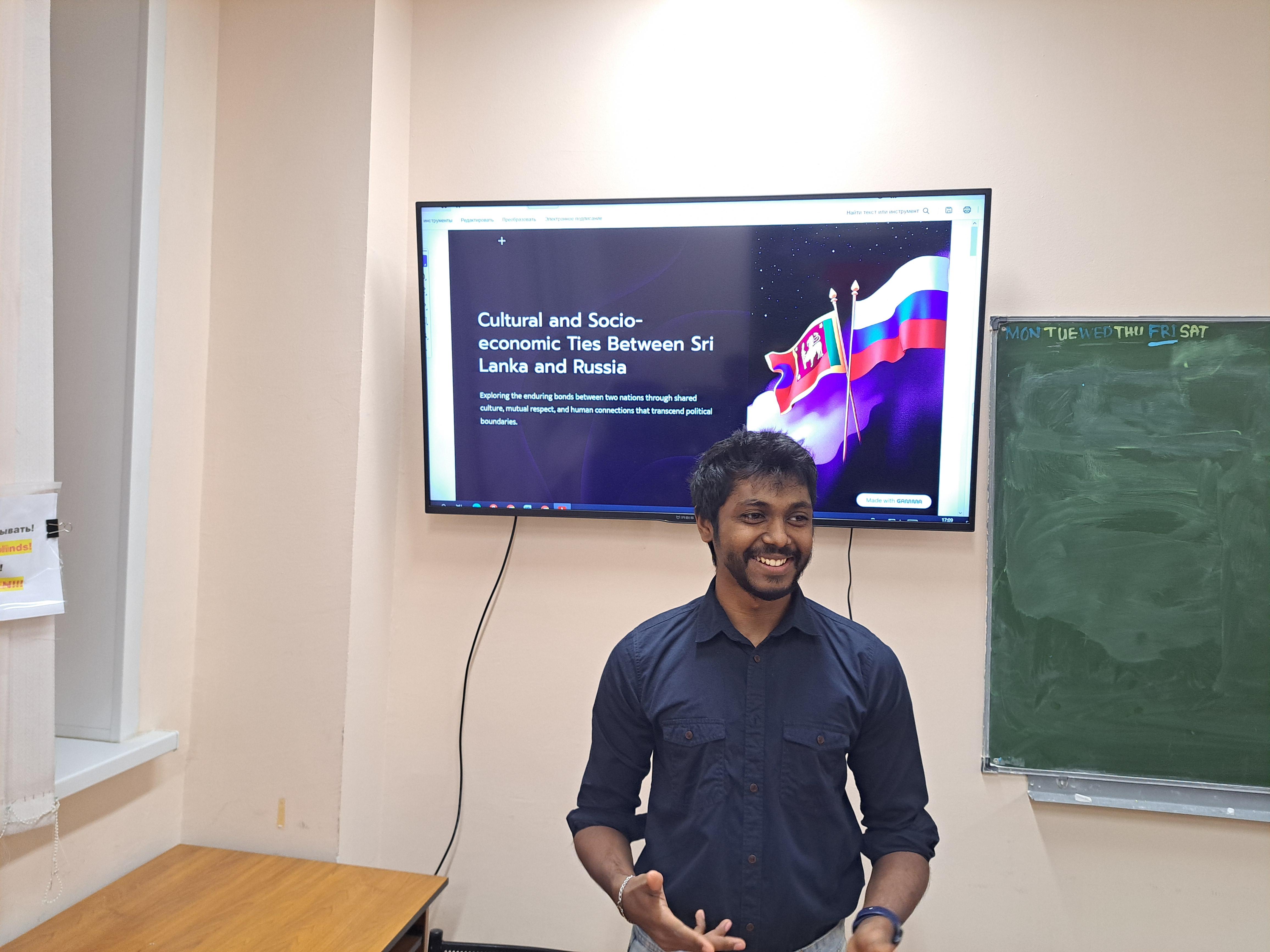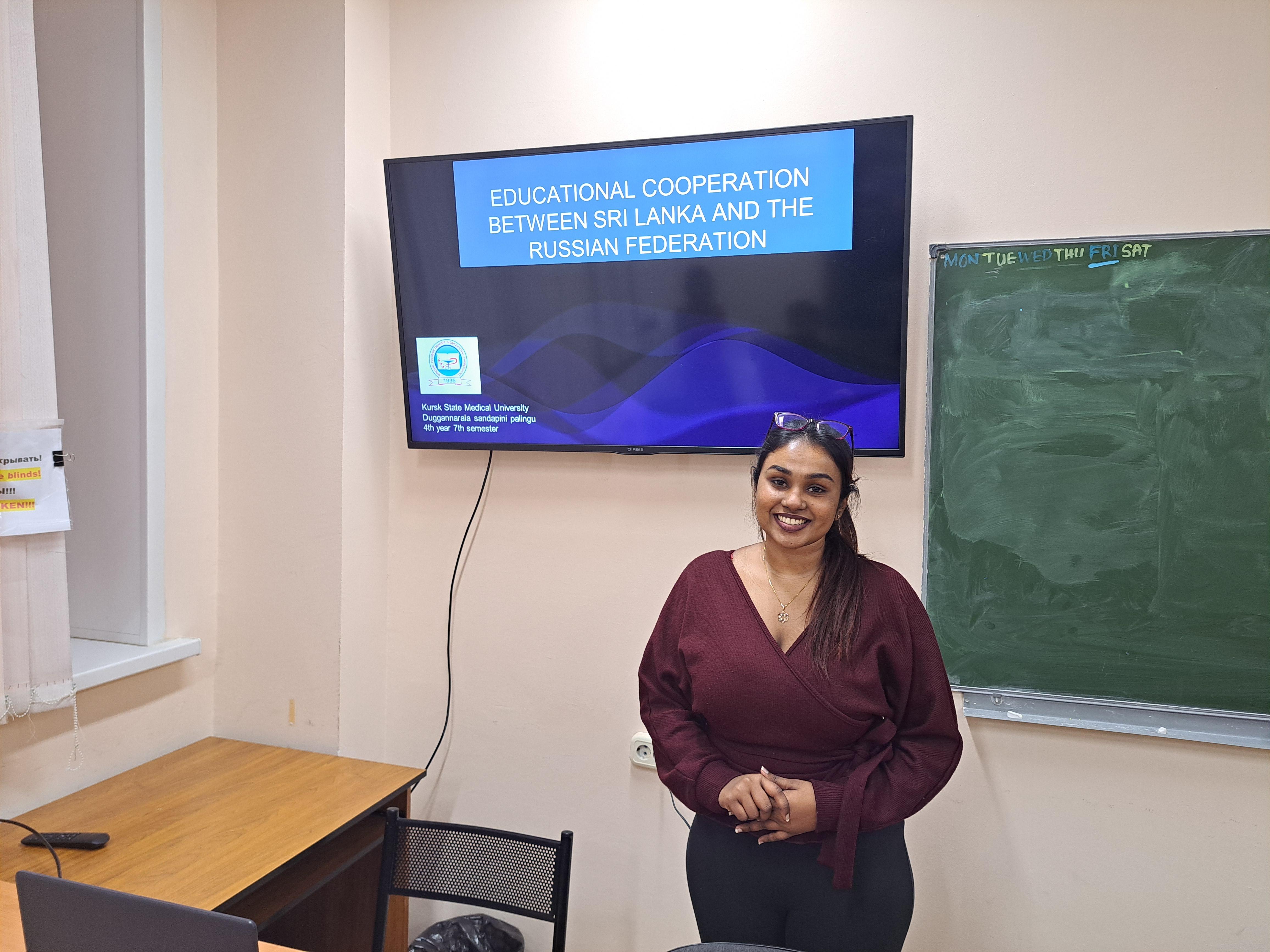 24 декабря 2025 г. ассистент кафедры внутренних болезней №1 Понкратов В.И. провел встречу с ланкийскими студентами, посвященную укреплению дружбы России и Шри-Ланки. Были заслушаны выступления студентов 2 и 4 курсов, посвященные культурным и социоэкономическим связям между Россией и Шри-Ланкой, образовательному сотрудничеству между двумя странами, а также жизни и быту ланкийских студентов, обучающихся в КГМУ. Доклады вызвали живой отклик у аудитории, способствуя живому общению и обмену мнениями. Участники подчеркнули необходимость дальнейшего проведения на кафедре мероприятий (в том числе научных, образовательных, воспитательных) с привлечением студентов из Шри-Ланки.