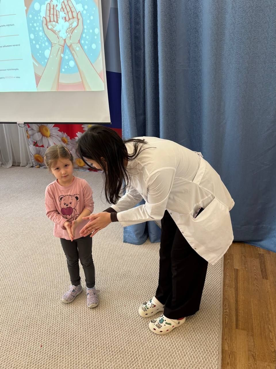 Волонтёры в игровой форме объяснили малышам, почему так важно мыть руки и что происходит, если пренебрегать гигиеной. Самой захватывающей частью стал мастер-класс по «обезвреживанию» бактерий. Дети вместе со старшими товарищами разучили правильную технику мытья рук