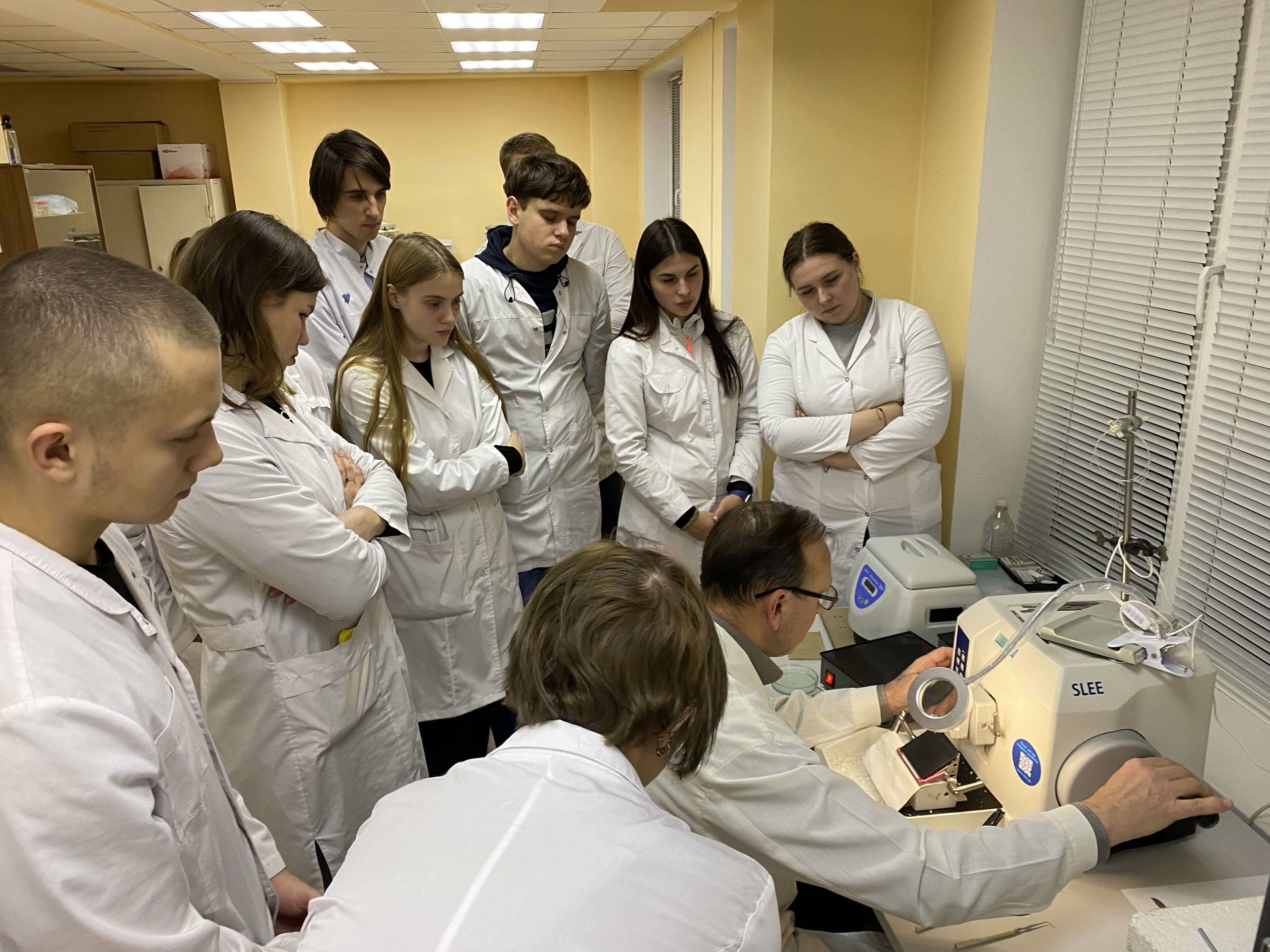 Вторую часть заседания студенты провели в лаборатории морфологии НИИ экспериментальной медицины, где наблюдали за изготовлением срезов патологического материала для дальнейшего исследования под руководством зав.кафедры, к.м.н. - Виктора Тарасовича Дудки