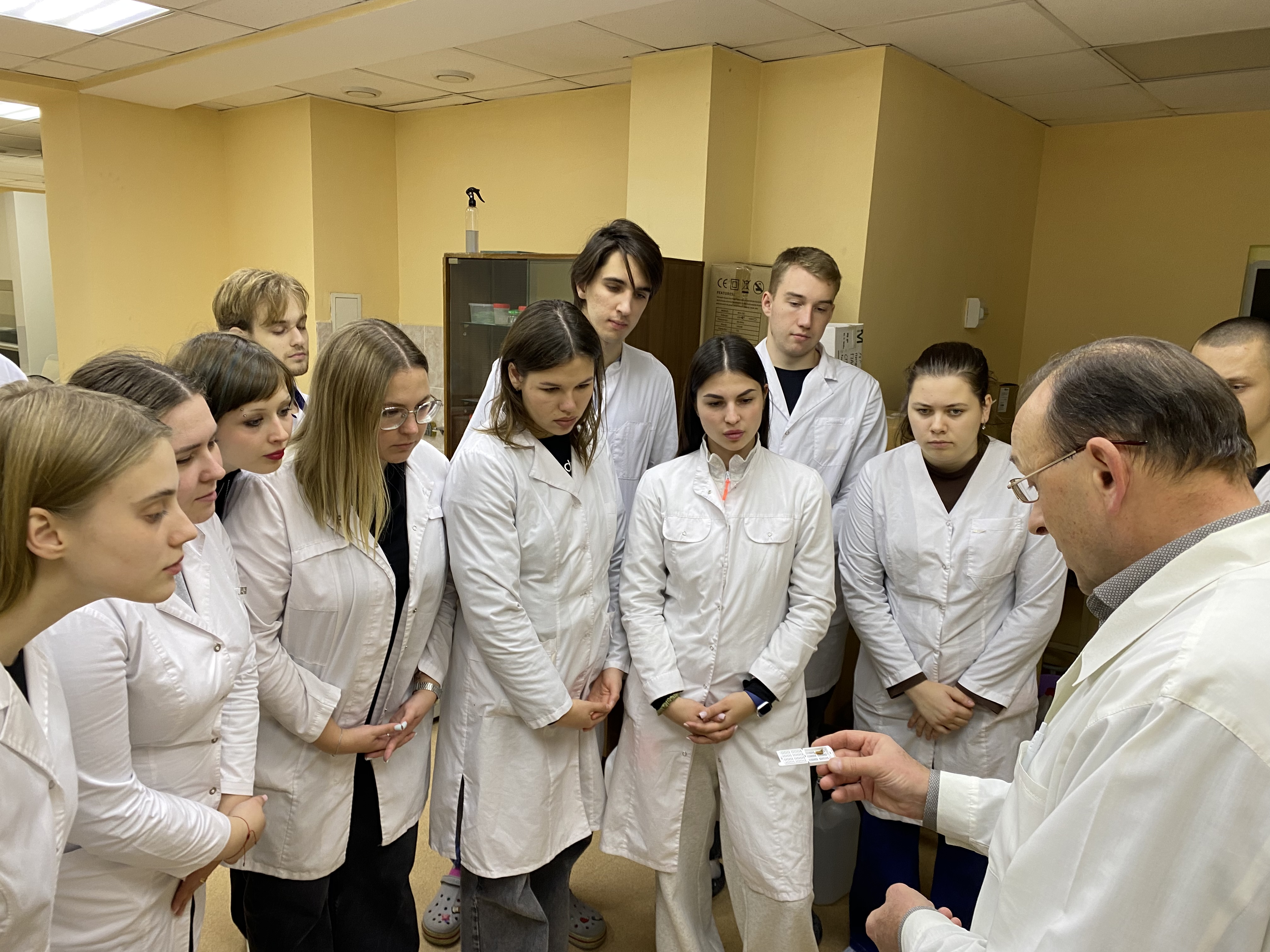 In the second part of the meeting, the students visited the Morphology Laboratory of the Research Institute of Experimental Medicine, where they observed the preparation of pathological material sections for further research under the guidance of the Head of the Department, MD, Viktor Tarasovich Dudka.