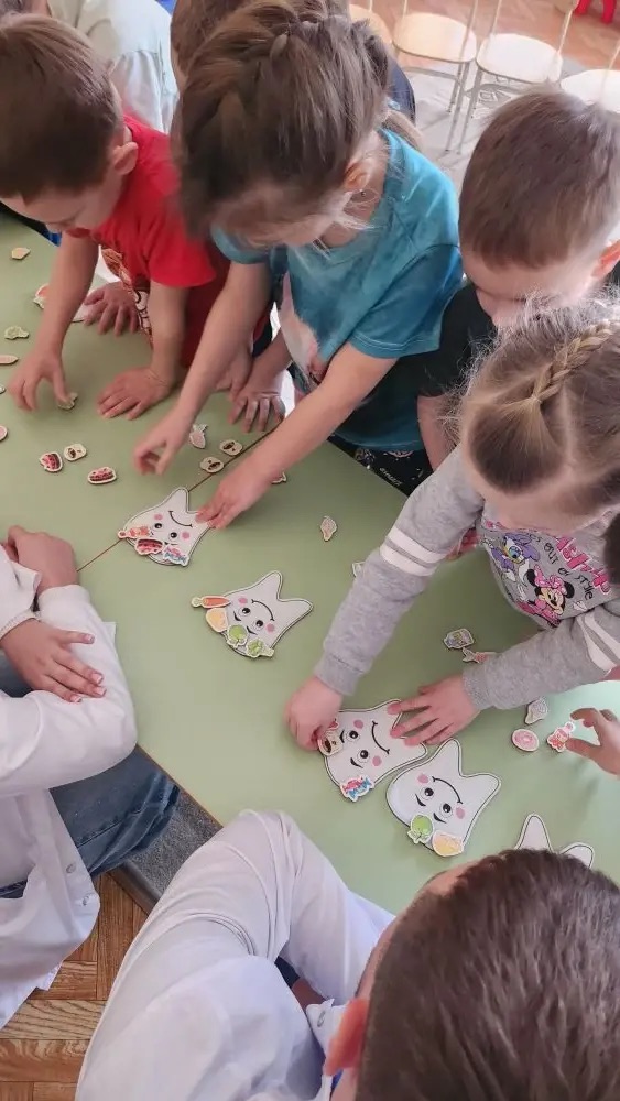 Волонтеры и Анна Юрьевна рассказали детям про кариес, его причины возникновения и опасность для зубов. На обучающей модели студенты-стоматологи с каждым ребенком индивидуально отработали навыки чистки зубов и ухода за полостью рта. Поиграли в игру « Что полезно, а что вредно для зубов?». Так же рассказали о правильном питании, о режиме питания и о важности овощей, фруктов, молочных продуктов для здоровья зубов.