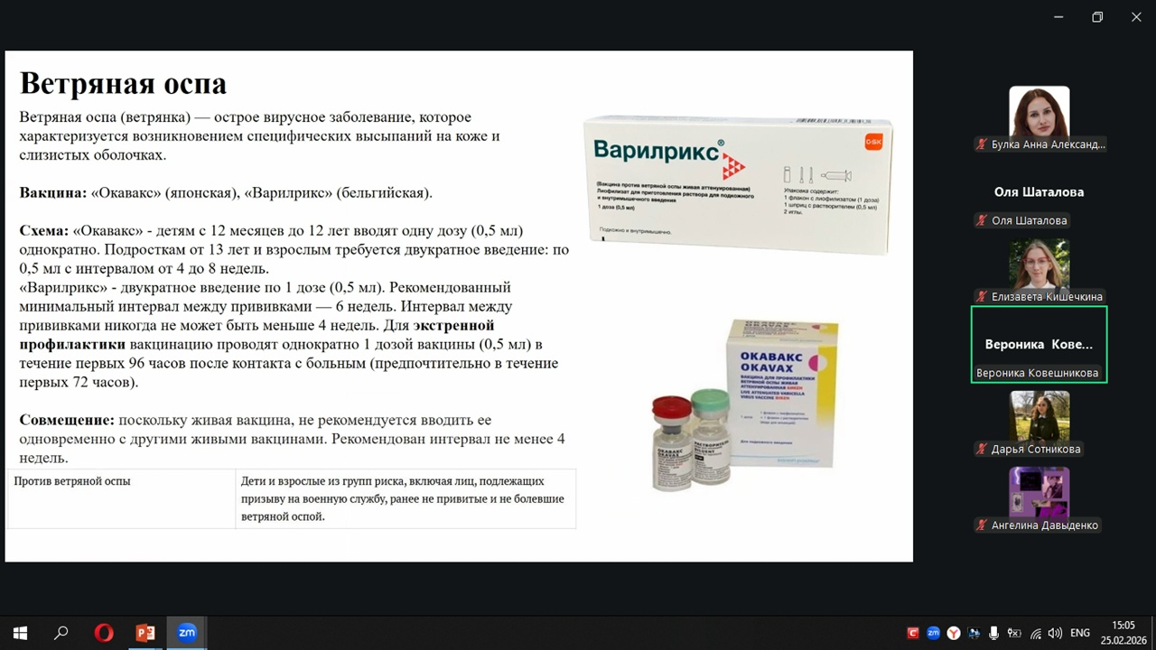 Ковешникова В.Е. (5 курс 6 группа педиатрический факультет) рассказала об особенностях вакцинации в рамках Национального календаря по эпидемическим показаниям. Отдельный акцент был сделан на группах риска и важности своевременной защиты детей в очагах инфекций.
