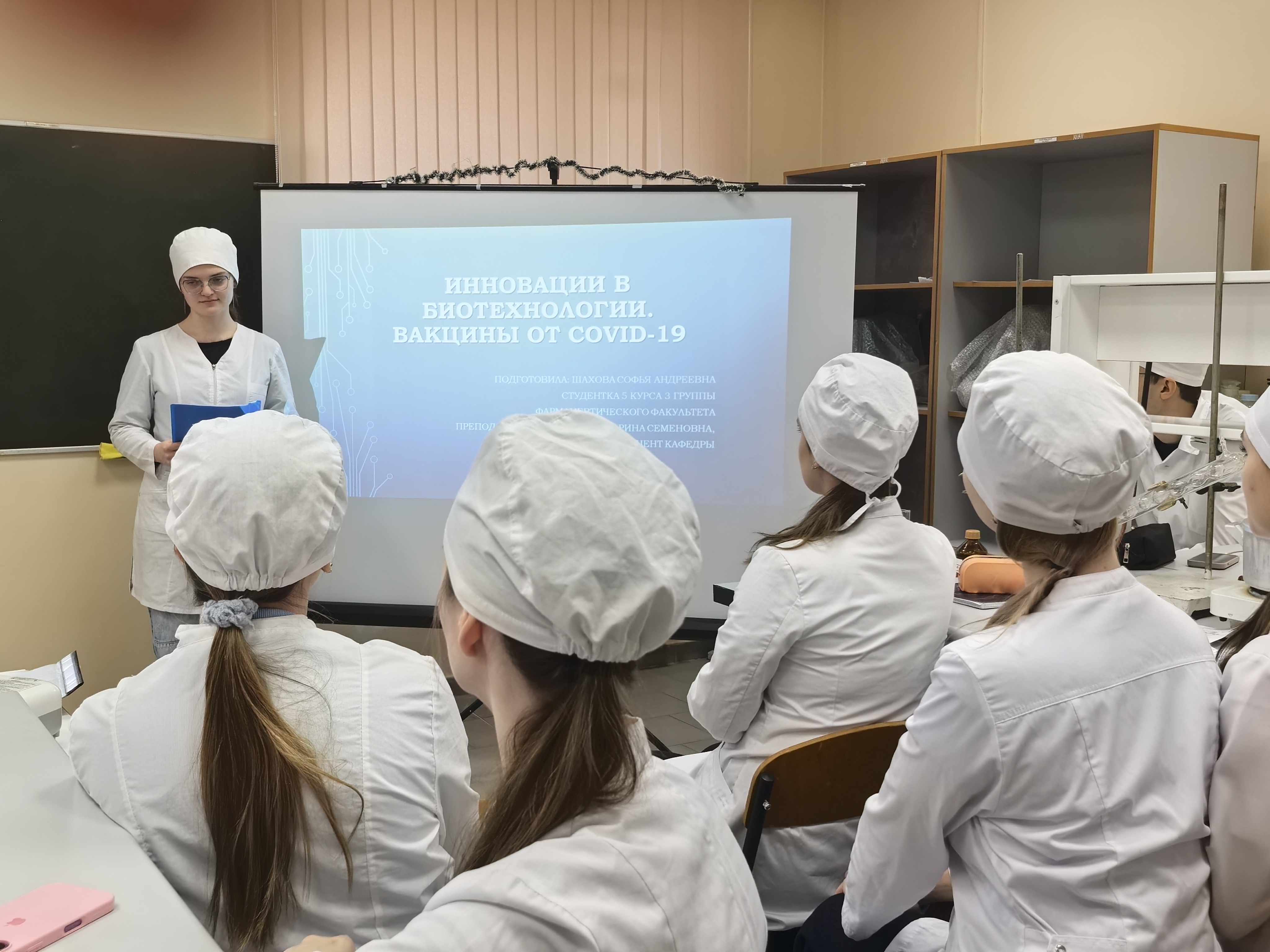 Доклад студентки Шаховой С.А. 3 гр. 5 курса на тему «Инновации в биотехнологии. Вакцины от COVID-19» вызвал живой интерес у студентов и продолжился дискуссией по вопросам технологии и эффективности таких препаратов.