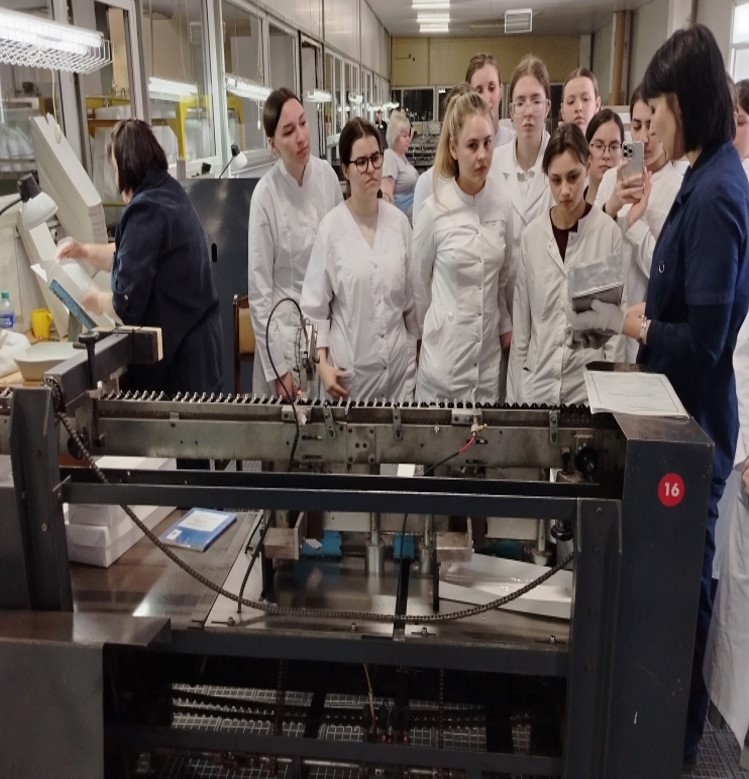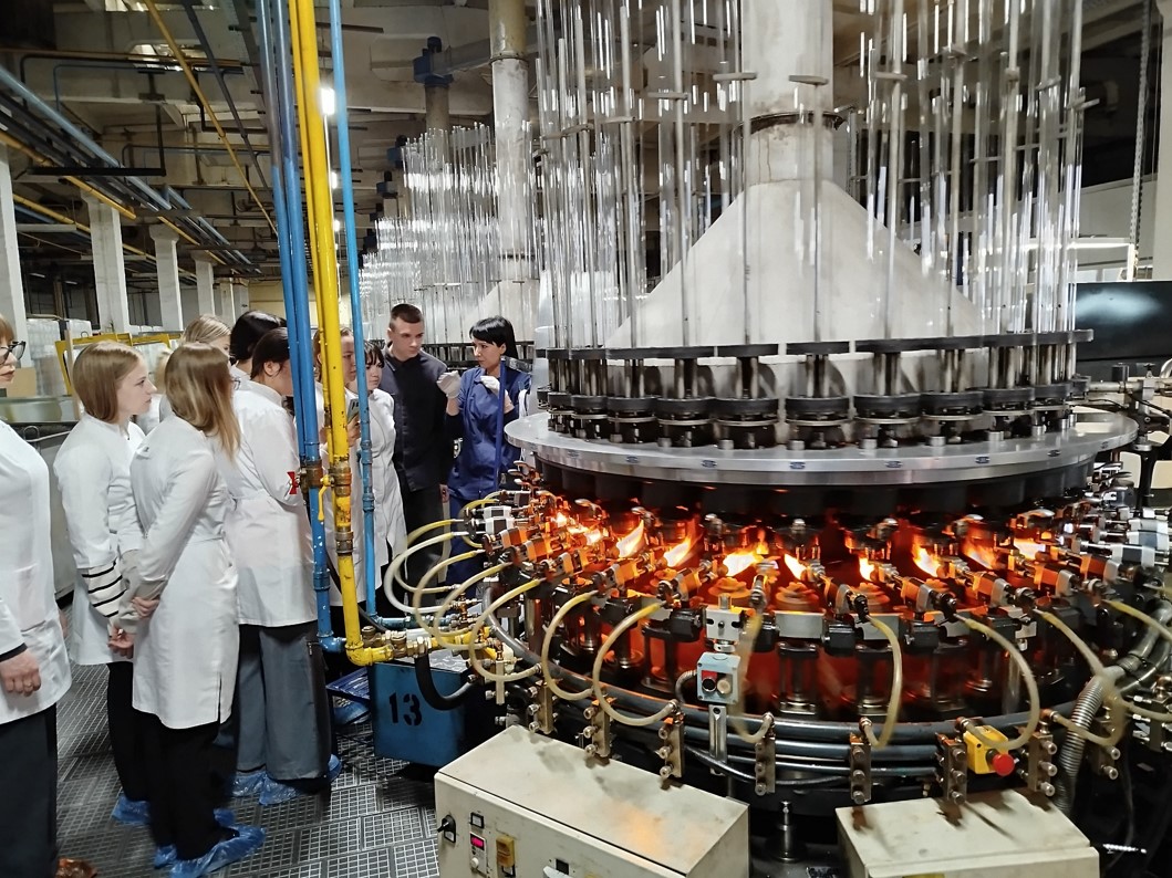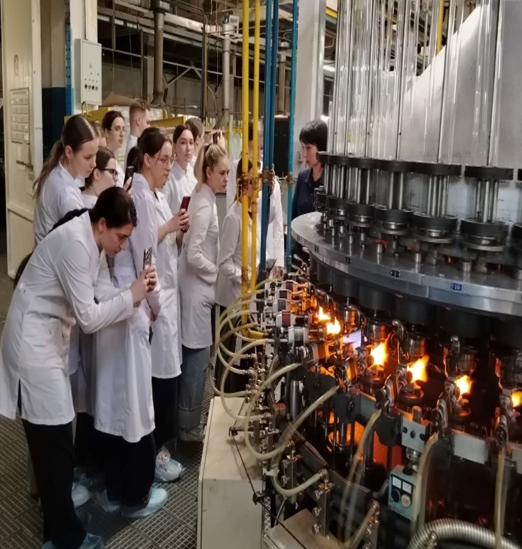 Начальник отдела управления качеством Агибалова Жанна Сергеевна подробно рассказала студентам об истории предприятия, его современном оснащении и производственной мощности, технологическом процессе варки медицинского стекла, производстве ампул и их стандартизации. Экскурсия последовательно проходила на участках стекловарения, резки и калибровки стеклянной трубки с последующей упаковкой, выделки ампул разной вместимости и формы, их отжига, стандартизации и фасовки. Студенты наглядно познакомились с работой современного оборудования, автоматизацией и контролем процесса производства стеклодрота и ампул; смогли на практике закрепить теоретические знания, полученные на практических занятиях.