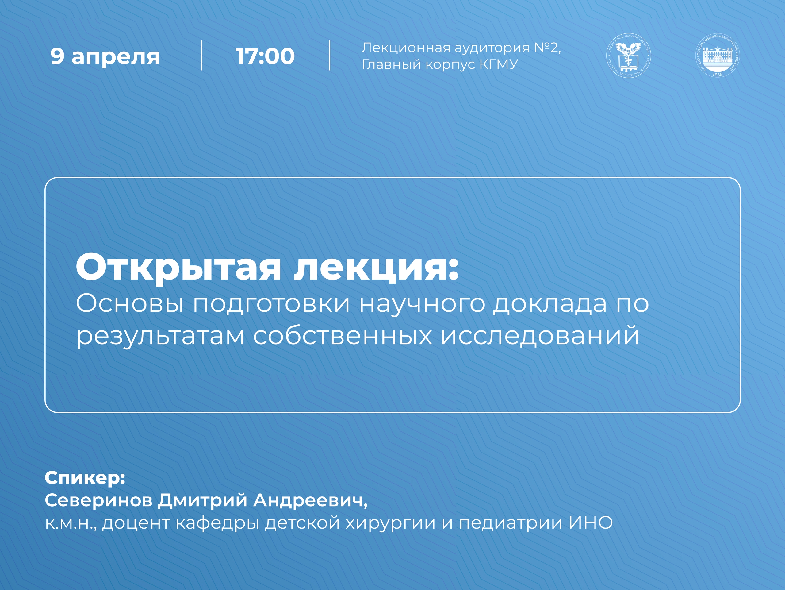 9 апреля 2026 г. члены студенческого научного кружка кафедры фармакогнозии и фармацевтической технологии, студенты 3 курса фармацевтического факультета и ММИ КГМУ: Акопян Ангелина Артуровна, Зинюк Виктория Евгеньевна, Кузнецова Алиса Сергеевна, Смицкая Александра Игоревна, Шанзи Джойс, Ничипоренко Елизавета Владимировна посетили открытую лекцию к.м.н., доцента кафедры детской хирургии и педиатрии ИНО Северинова Дмитрия Андреевича на тему: «Основы подготовки научного доклада по результатам собственных исследований».