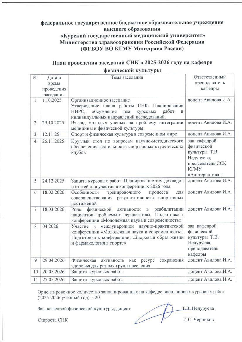 План работы СНК кафедры физической культуры на 2025-2026 уч.год