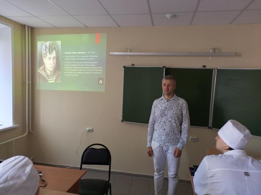 Заведующий историко-проектным отделом Курского областного краеведческого музея, кандидат исторических наук Алексей Игоревич Чубаров рассказал студентам о Героях Советского Союза, удостоившихся высшей государственной награды нашей страны за боевые заслуги в войне с милитаристской Японией в августе-сентябре 1945-го года: