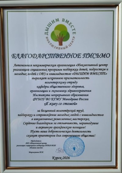 За активную волонтерскую деятельность в инклюзивном центре реализации социальных программ поддержки детей подростков и молодых людей с ОВЗ и инвалидностью «Дышим вместе», волонтерский отряд кафедры общественного здоровья, организации и экономики здравоохранения ИНО Курского государственного медицинского университета был награжден благодарственным письмом!