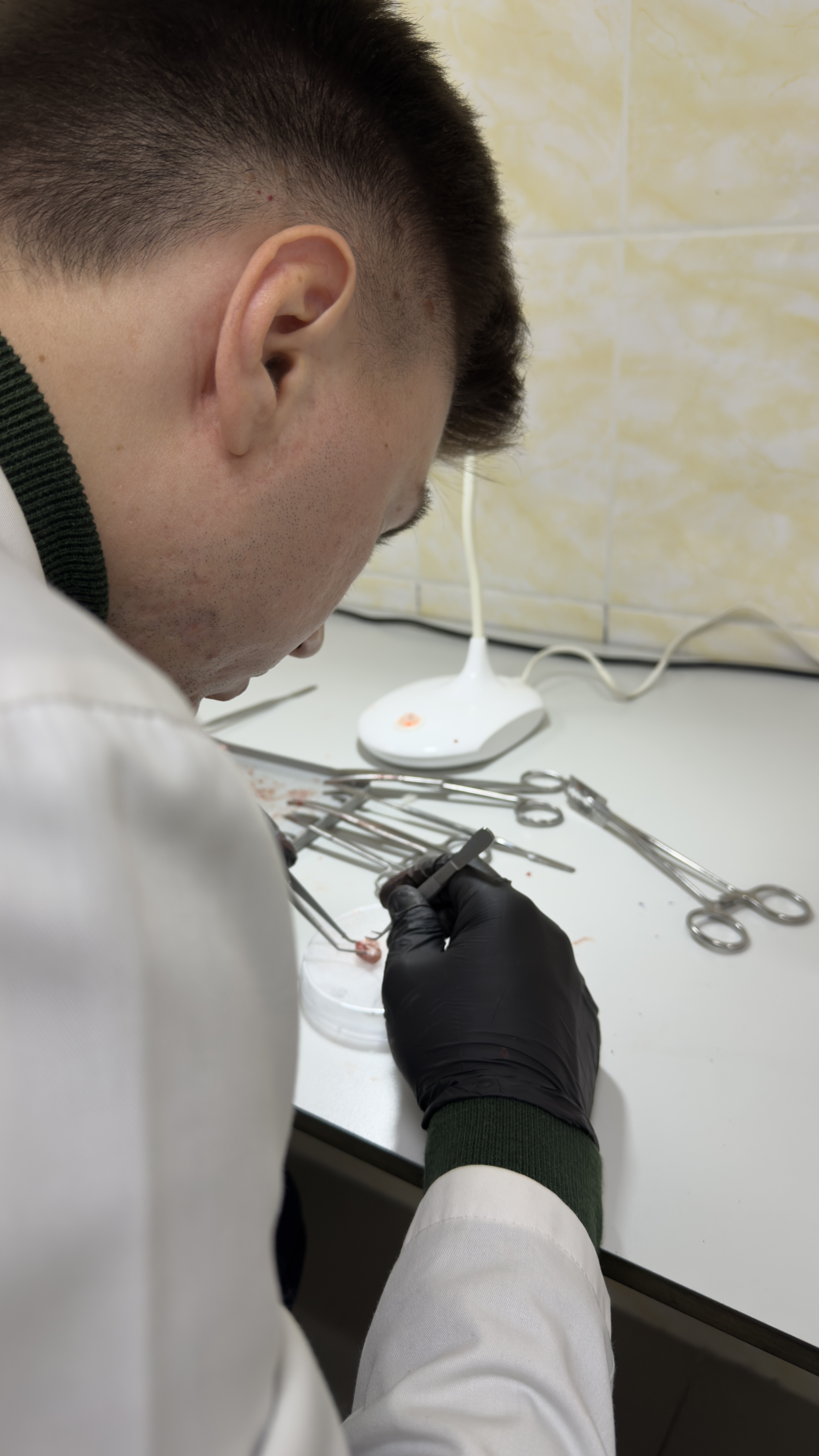 Сегодня в рамках исследования по изучению эффектов стресса на морфофунциональное состояние кишечно-мозговой оси, проводимого совместно с кафедрой микробиологии, студенты третьего курса под руководством доцента кафедры патофизиологии Антона Олеговича Ворвуля и ассистента кафедры микробиологии, вирусологии, иммунологии Екатерины Сергеевны Ворсиной и под чутким наставничеством студентов Дарьи Штотланд, Дмитрия Апалькова, Святослава Юрина и Натальи Козловой продолжили выполнять поведенческие исследования, начали осваивали основы забора биологического материала, а также его пробоподготовки для микробиологических, морфологических, иммунологических и генетических исследований.