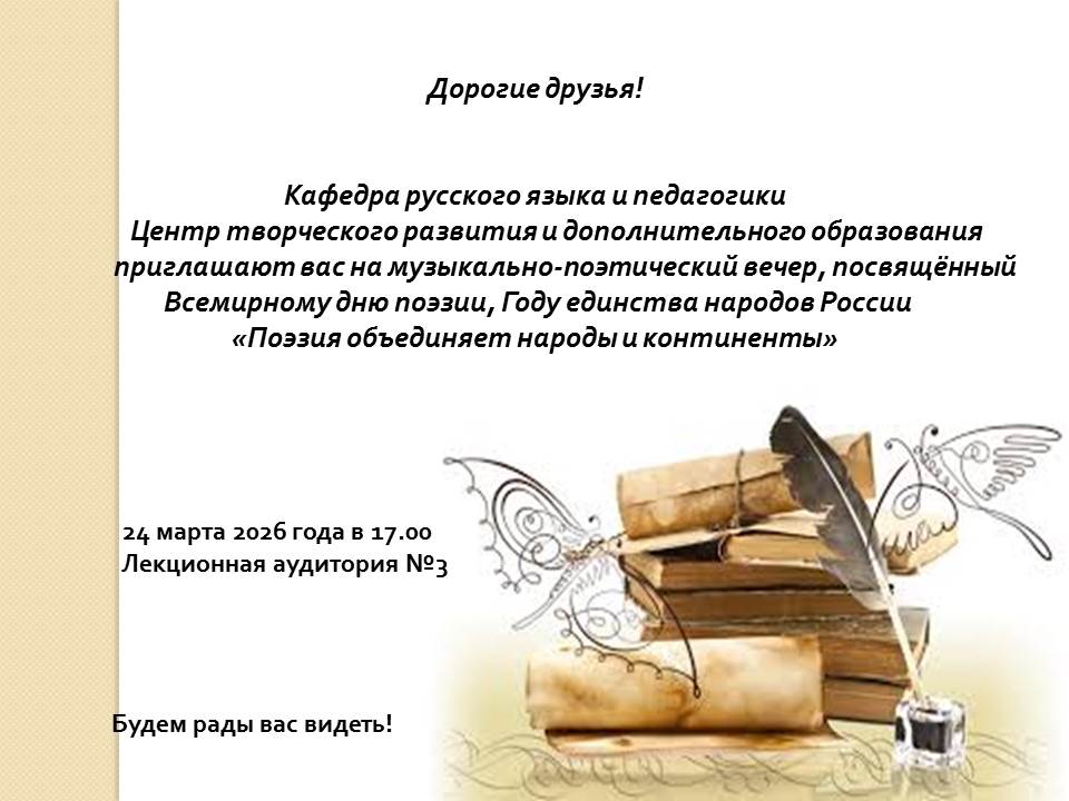 В КГМУ ПРОШЕЛ ТРАДИЦИОННЫЙ ЛИТЕРАТУРНО-МУЗЫКАЛЬНЫЙ ВЕЧЕР «ЦВЕТОВ ДУШИСТЫХ АРОМАТ», ПОСВЯЩЕННЫЙ ВСЕМИРНОМУ ДНЮ ПОЭЗИИ.