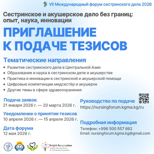Кыргызская государственная медицинская академия им. И.К. Ахунбаева приглашает принять участие в работе VII Международного форума сестринского и акушерского дела 2026 «Сестринское и акушерское дело без границ: опыт, наука, инновации», который состоится 12 мая 2026 года.