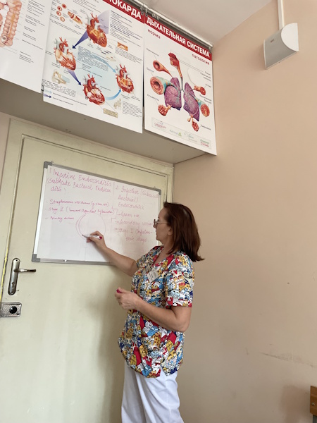 The lecturer in charge, Associate Professor Marina Aleksandrovna Chernyatina, PhD, presented on the structural anatomy of the heart, determining the degree of myocardial wall thickening, vessel size, and valve structure and mobility. The meeting also covered the essence of color Doppler mapping, the presence and degree of regurgitation, and determining cardiac ejection fraction.