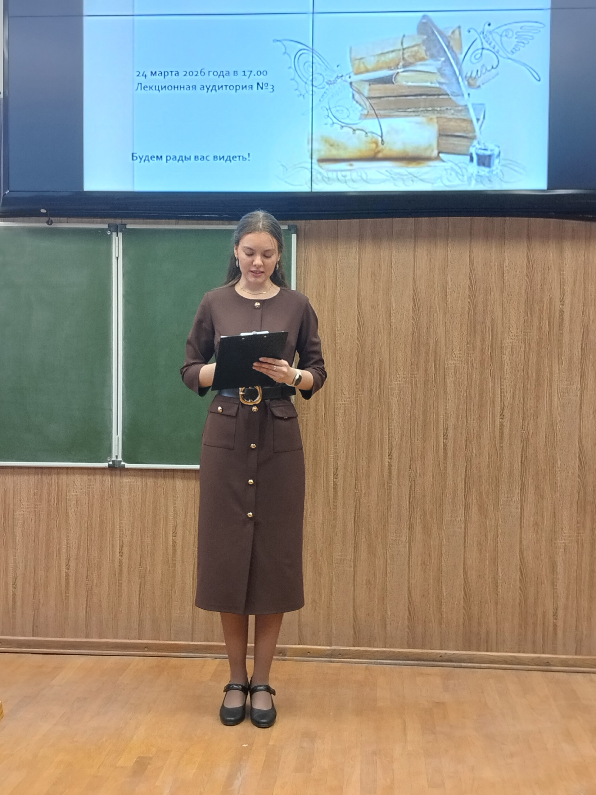 Вчера, 24 марта 2026 года на кафедре русского языка и педагогики совместно с Центром творческого развития и дополнительного образования был организован музыкально-поэтический вечер, посвященный Всемирному дню поэзии, году единства народов России «Поэзия объединяет народы и континенты», где присутствовали проректор по воспитательной работе, социальному развитию и связям с общественностью, доцент КГМУ Кузнецова Алеся Анатольевна, заведующая кафедрой русского языка и педагогики, доцент Ковынева Ирина Анатольевна, преподаватели и студенты. Ведущими мероприятия была выбрана староста кружка кафедры общей и биоорганической химии и активистка Литературного бюро КГМУ– студентка 3 курса фармацевтического факультета Разинькова Екатерина Максимовна совместно со студентом биотехнологического факультета Смирновым Никитой.