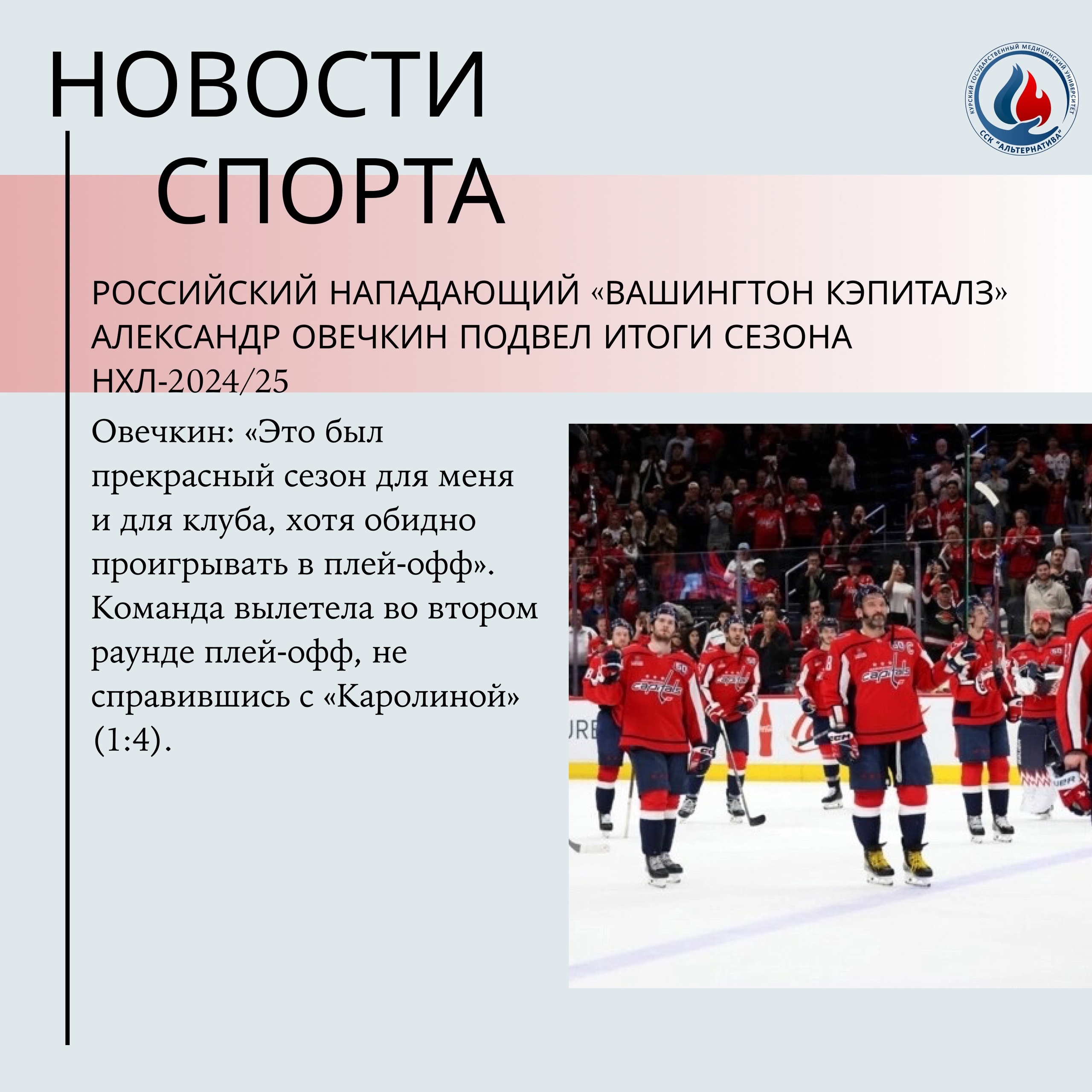 Овечкин: «Это был прекрасный сезон для меня и для клуба, хотя обидно проигрывать в плей‑офф». Команда вылетела во втором раунде плей‑офф, не справившись с «Каролиной» (1:4).