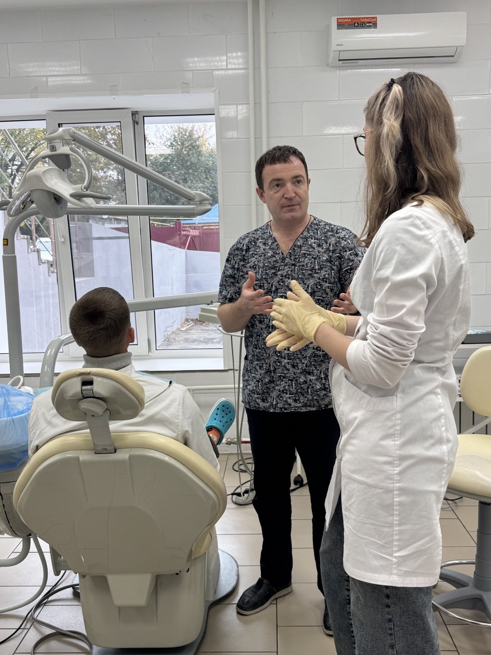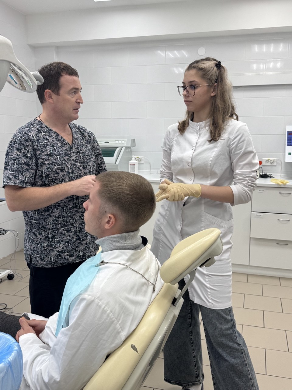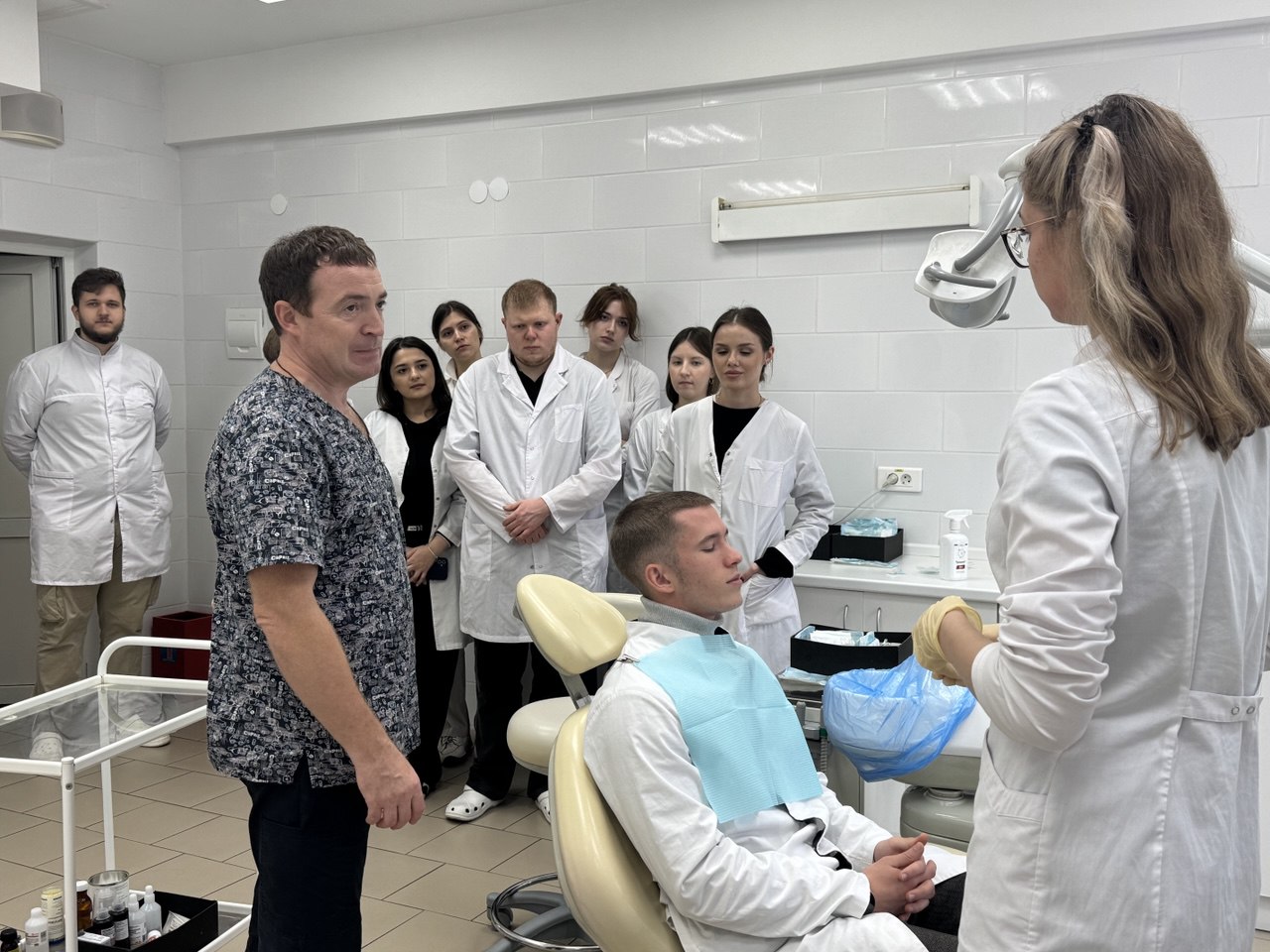 Доцент кафедры, к.м.н. Михаил Анатольевич Лунев проводит занятие со студентами стоматологического факультета, посвященное консультации и осмотру пациентов с заболеваниями челюстно-лицевой области.