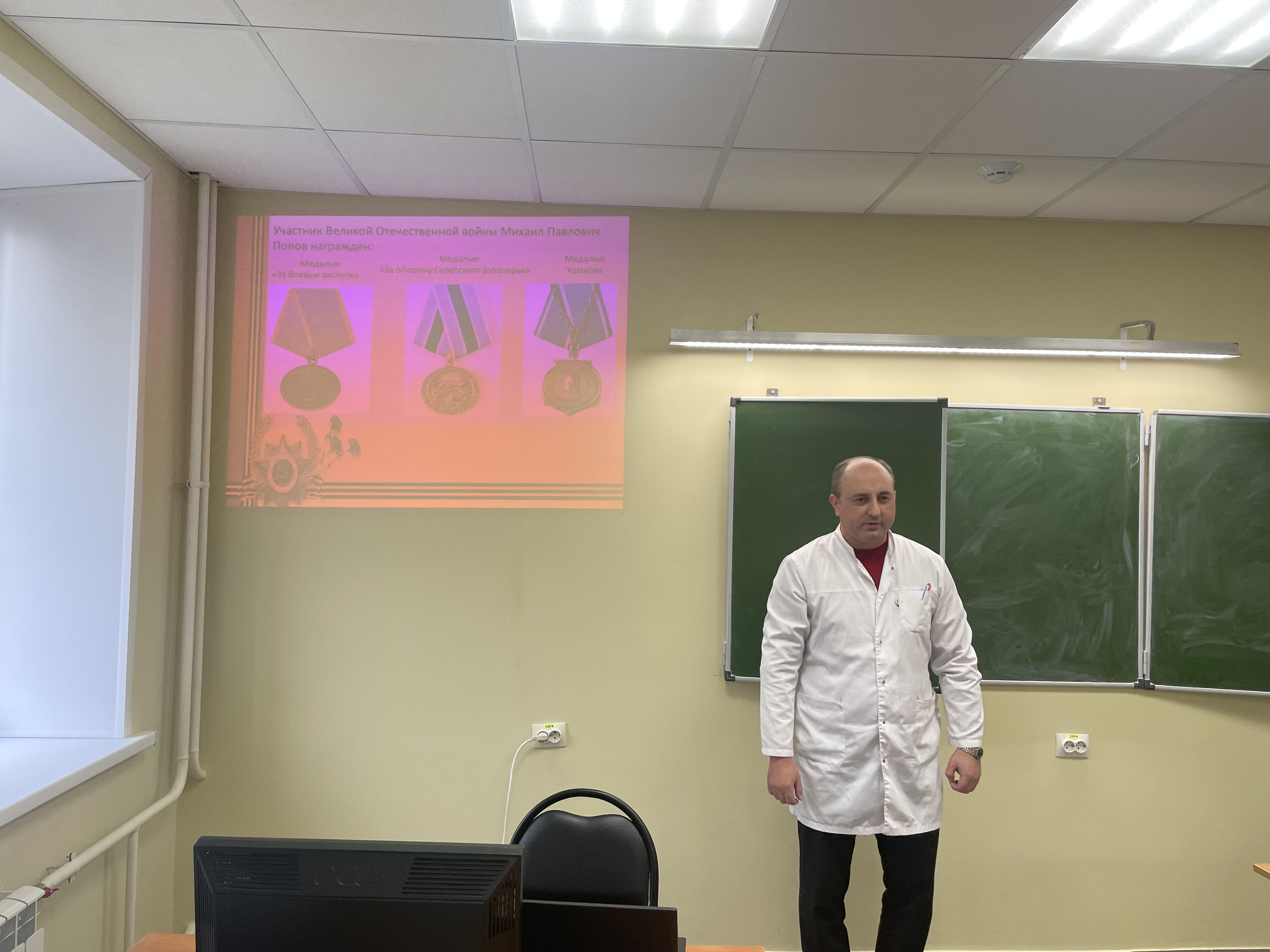 Доцент кафедры физики, информатики и математики Гранкин Валерий Егорович рассказал студентам о фактах боевой и трудовой биографии профессора Курского государственного медицинского университета Михаила Павловича Попова.