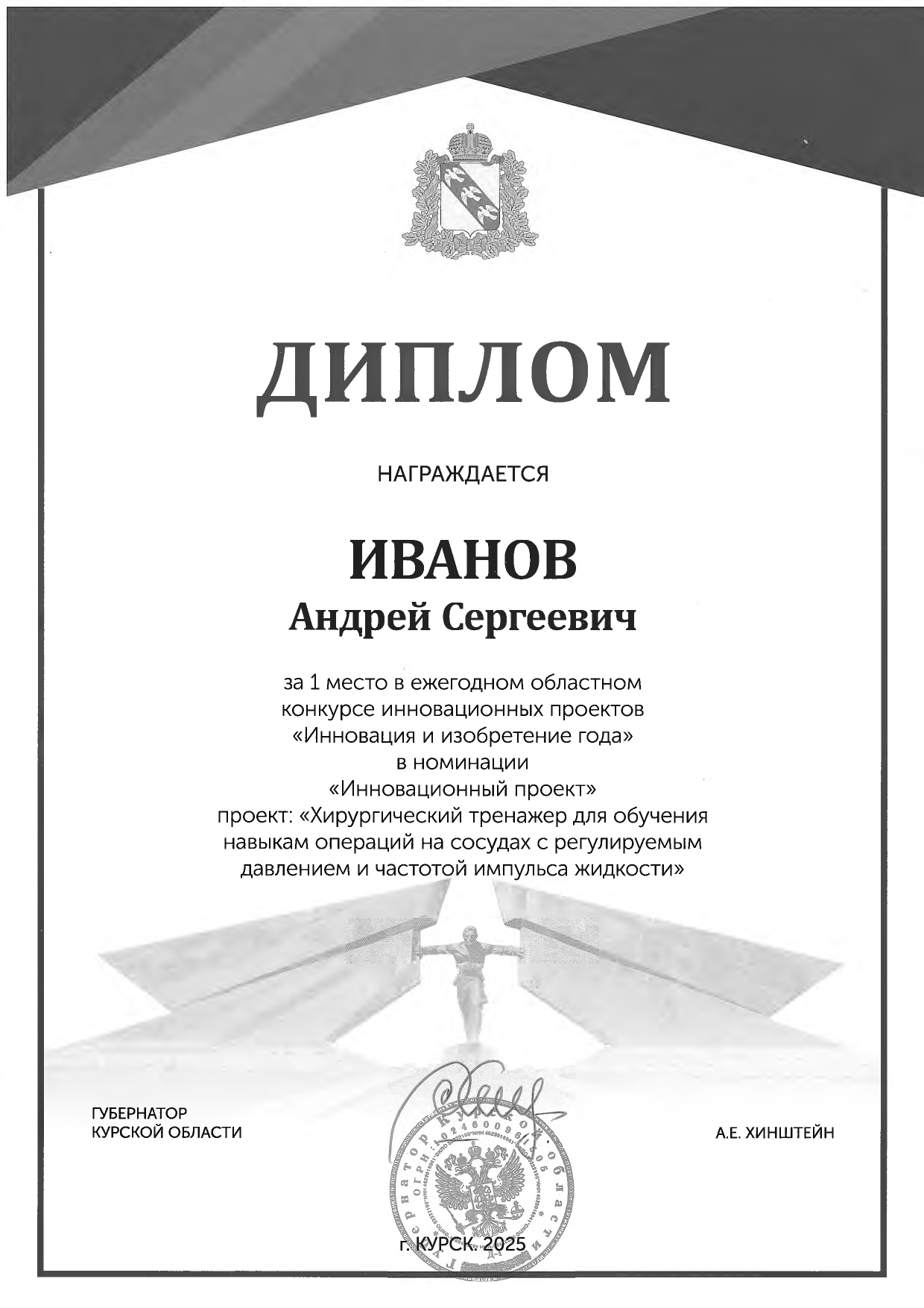 «Хирургический тренажер для обучения навыкам операций на сосудах с регулируемым давлением и частотой импульса жидкости» - так называется аппарат, разработанный с участием студента нашего университета Андрея Иванова.