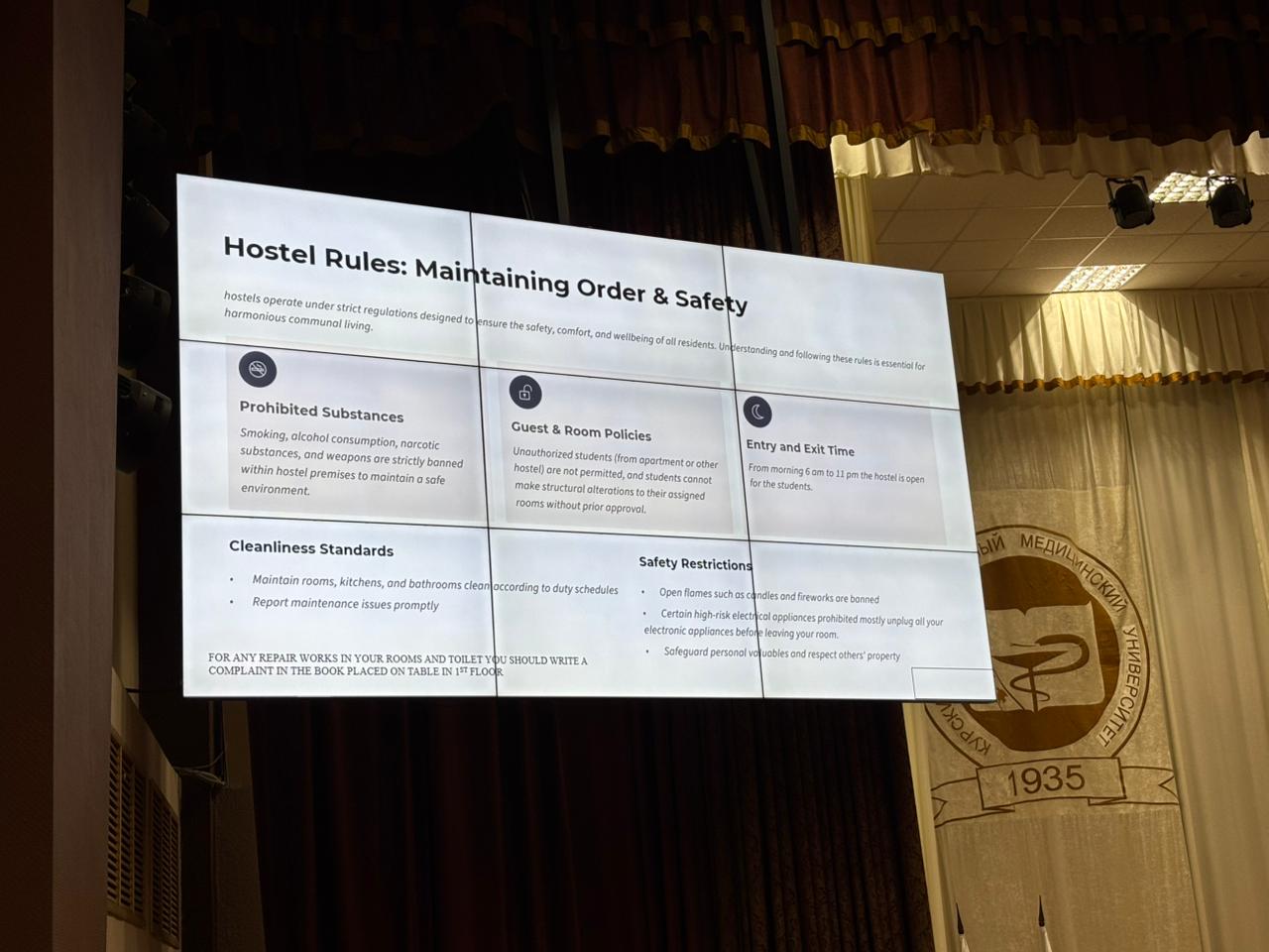 Новогодние праздники и зимние каникулы – чудесное время! Однако нельзя забывать о правилах безопасности. 23.12.2025 года для иностранных обучающихся Курского государственного медицинского университета в рамках профилактических мероприятий были проведены инструктажи по технике безопасности в зимний период. На встрече присутствовали: заместитель директора по общим вопросам ММИ Дремина Т.Ф., директор студенческого городка Тарасова О.Н., воспитатель отдела социокультурной адаптации ММИ Дугина М.В., сотрудники и 520 иностранных студентов.