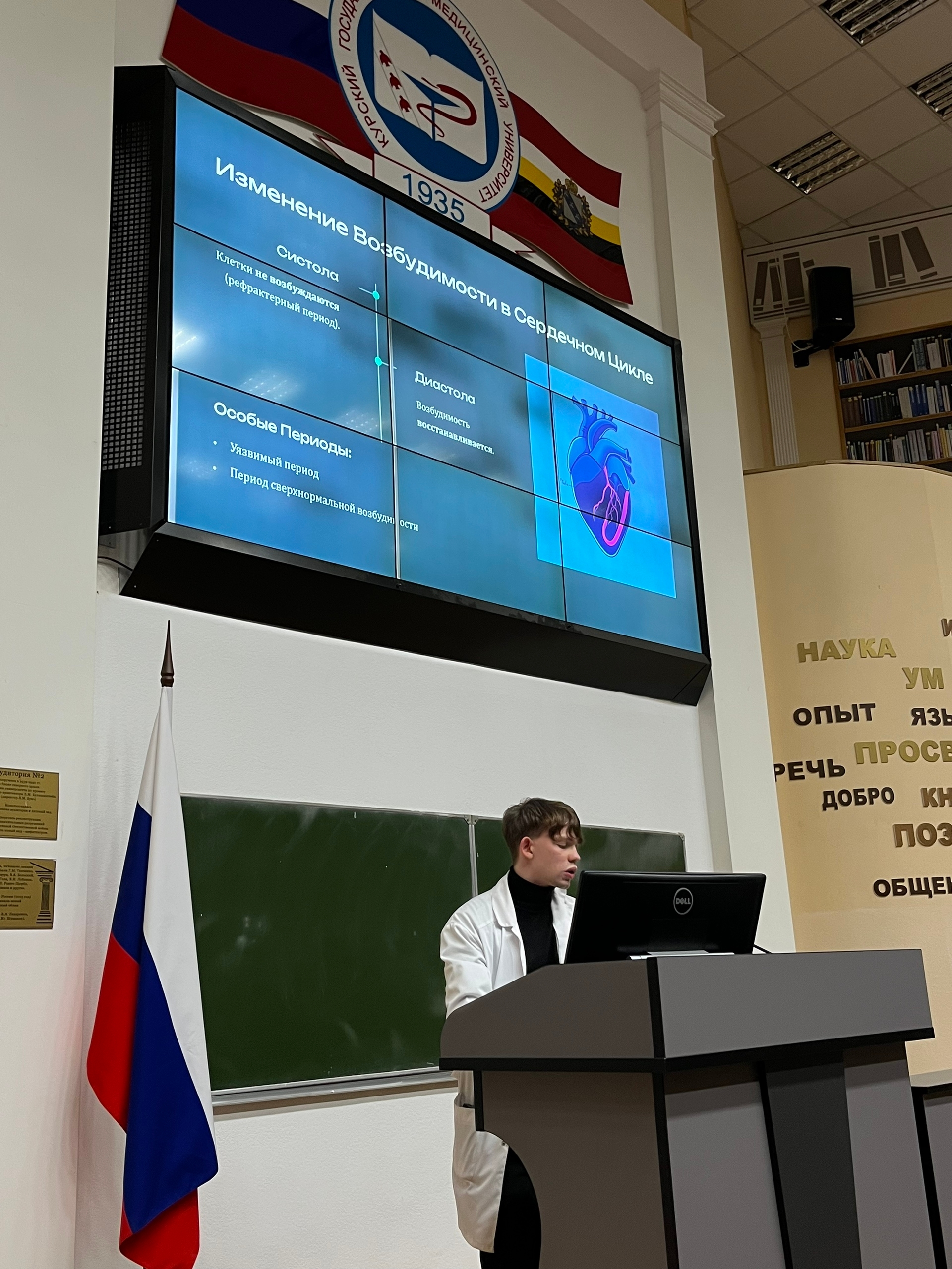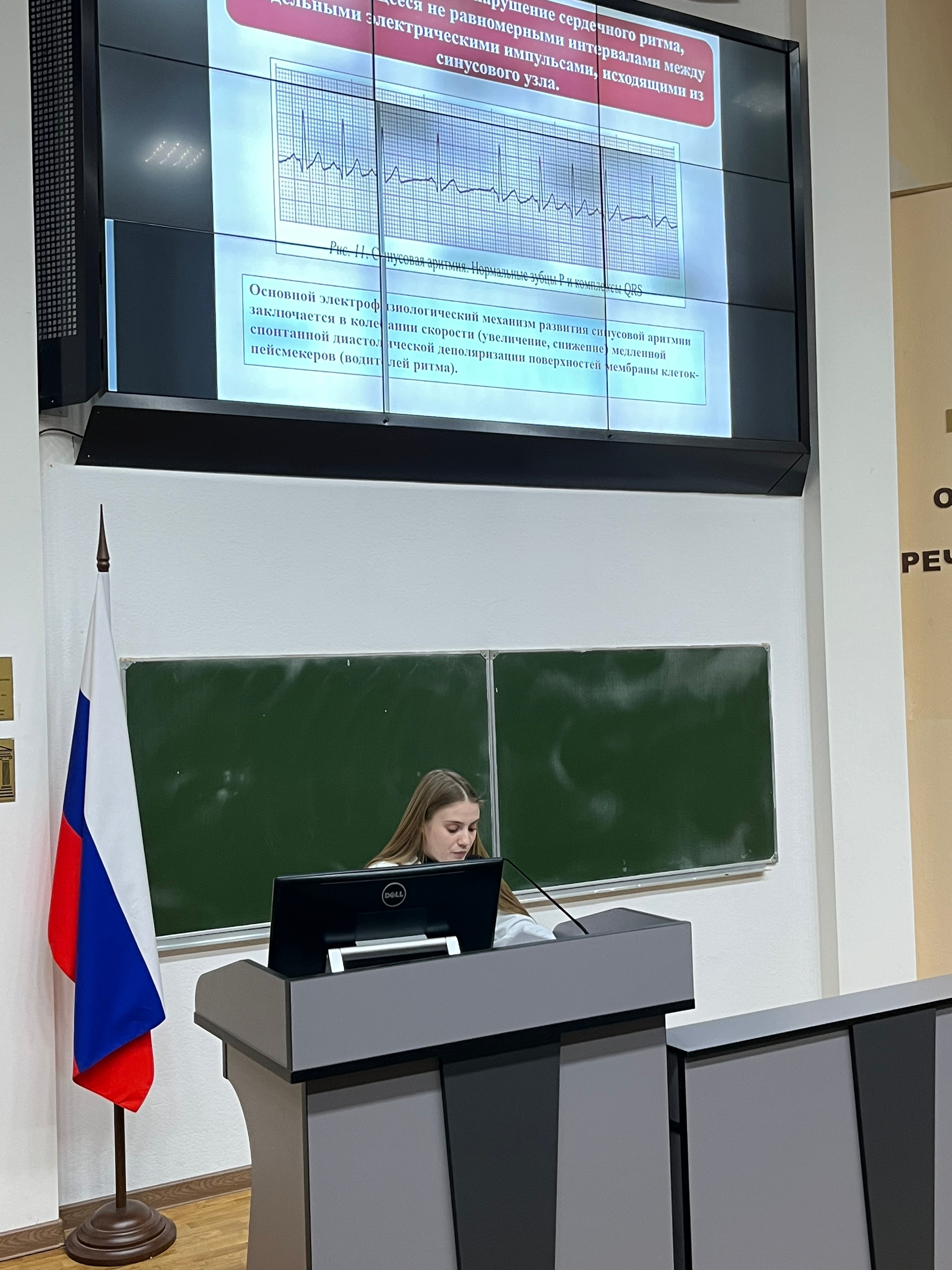 December 24, 2025, an interdepartmental meeting of the Pathophysiology Students Scientific Club and the Normal Physiology SSC was held on the topic «Etiology and Pathogenesis of Arrhythmias». Responsible teachers: Professor, Doctor of Biological Sciences Privalova I.L., Associate Professor, Candidate of Medical Sciences Korobova V.N. The meeting was attended by second and third-year students from the General Medicine and Pediatric faculties.