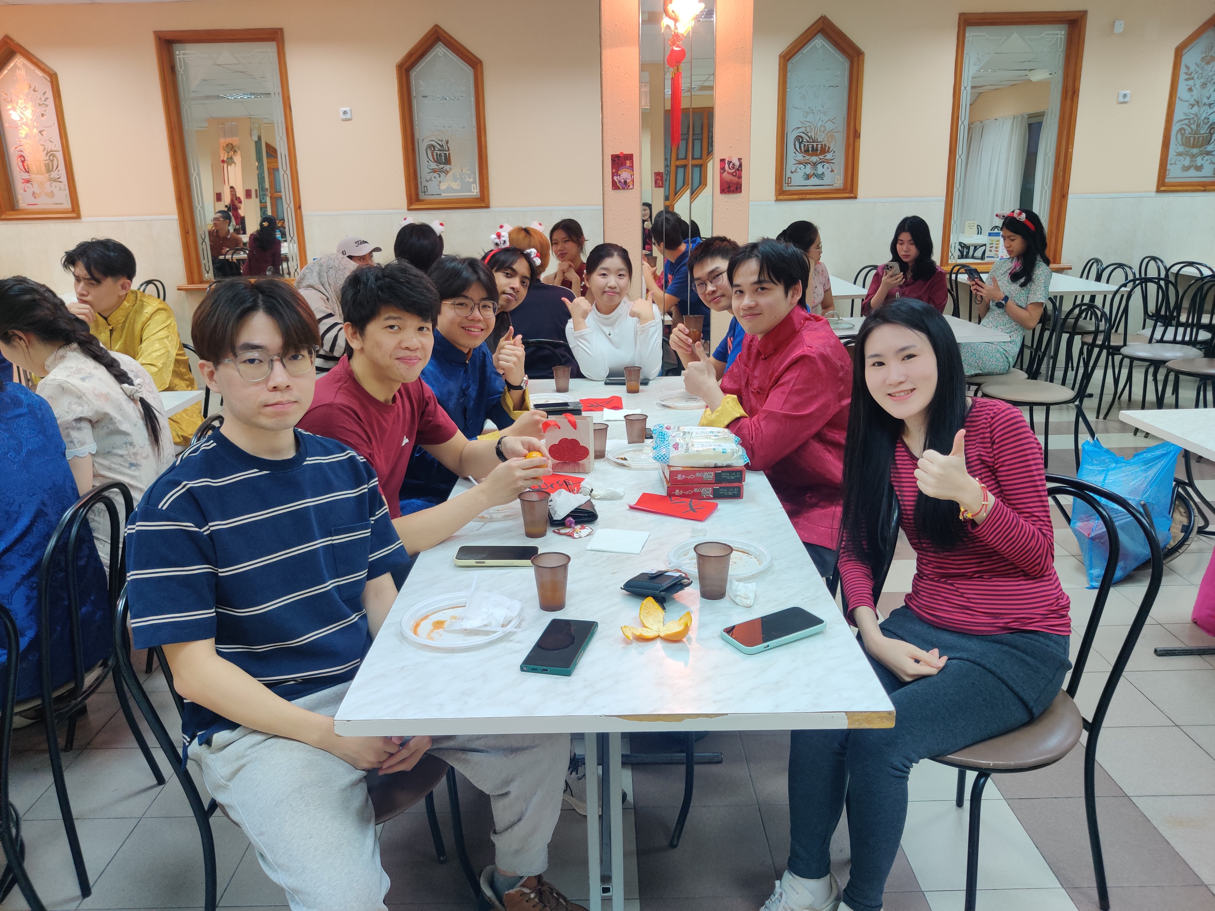 Помещение столовой преобразилось: красные фонарики, гирлянды с золотыми иероглифами украшали стены. Повсюду чувствовались ароматы восточных специй — они манили к праздничному столу, где гостей ждали традиционные угощения.