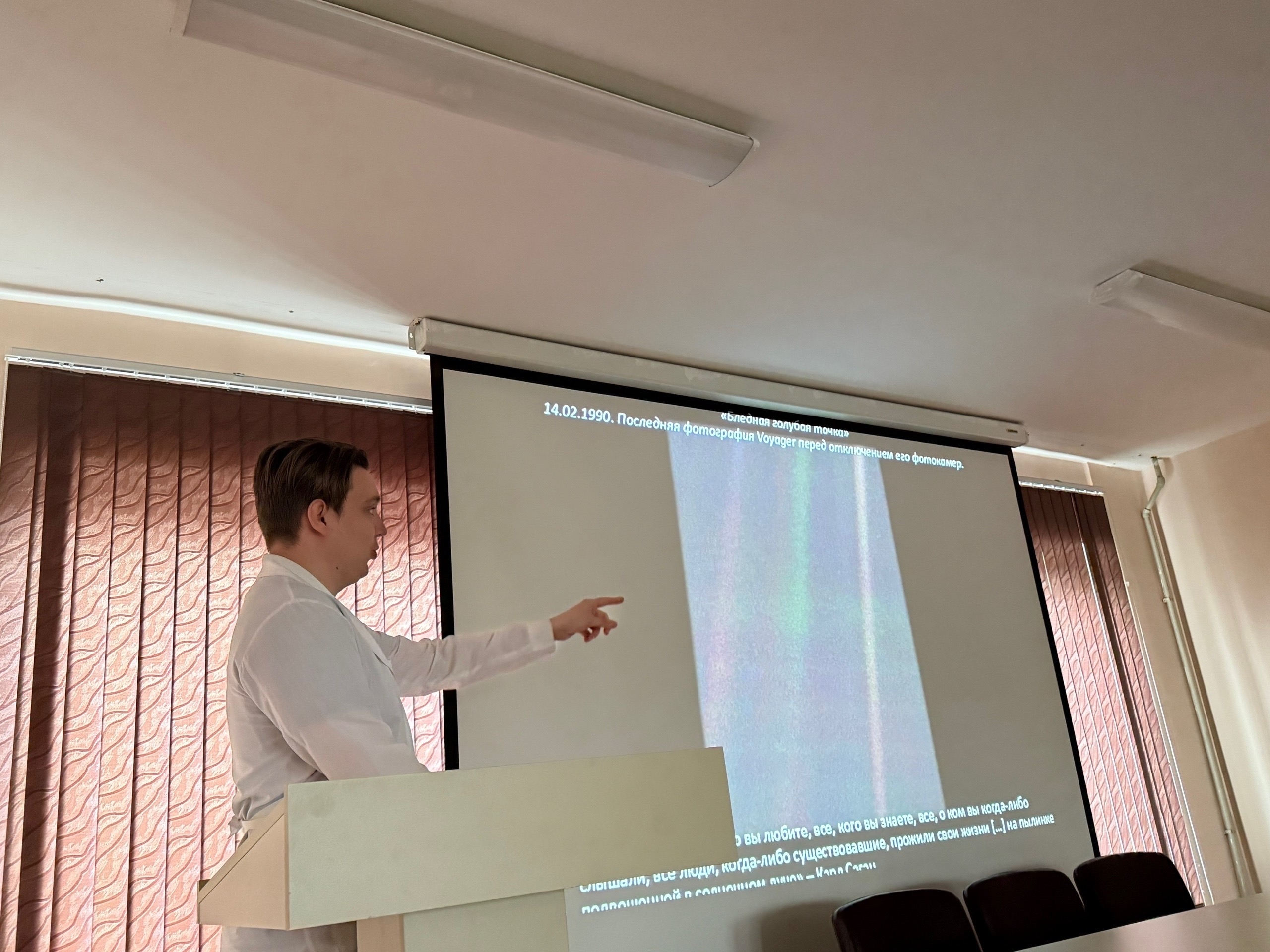 Студенты 6го курса лечебного факультета Валентина Хачатрян, Кристина Попова, Андрей Токмаков в своих выступлениях: осветили ключевые проблемы, с которыми сталкиваются медики при подготовке и сопровождении космических миссий; поделились историями о космонавтах, родившихся или связанных с Курской областью, — это добавило мероприятию особую локальную значимость; обсудили тему: «Космонавтика: вчера, сегодня, завтра», показав эволюцию отрасли и обозначив перспективные направления. Также был представлен доклад Андрея Якушева, посвящённый легендарной космической программе «Voyager» и уникальному посланию человечества — «Золотой пластинке».Выступление раскрыло научные, технические и культурные аспекты одной из самых амбициозных миссий в истории космонавтики.