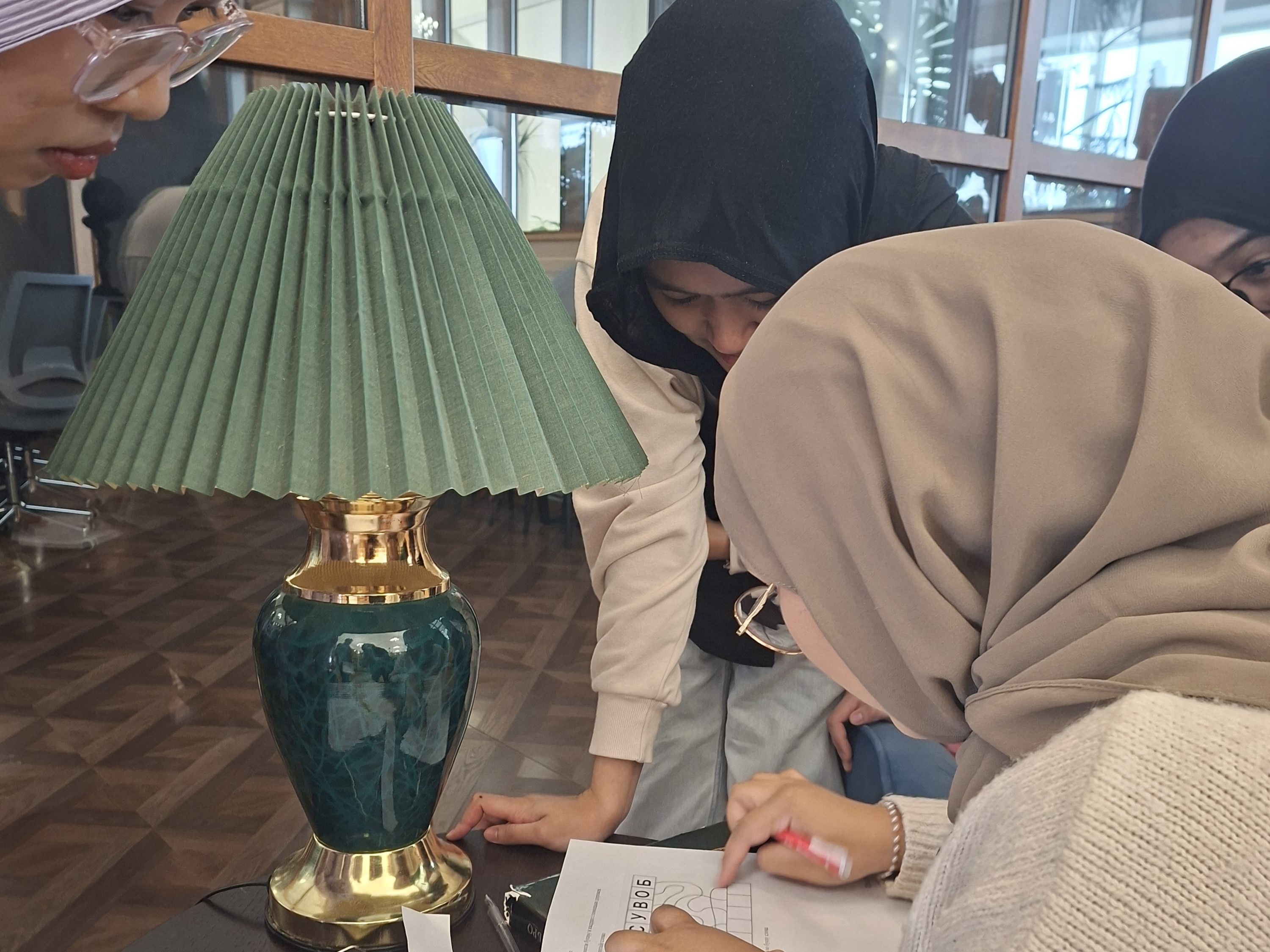 В большом зале университетской библиотеки были организованы «станции», по которым обучающимся необходимо было пройти, предварительно получив задание. Квест проводился исключительно на русском языке, без использования телефона и программ для перевода.