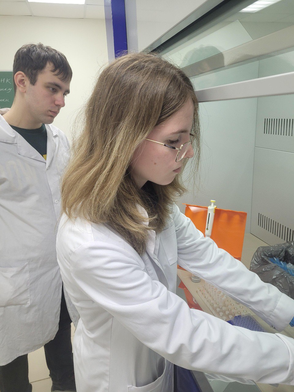 On March 14, 2025, a practical meeting of the student scientific society of the Department of Biological and Chemical Technology was held on the topic "Methods of extraction of nucleic acids from biological samples". The meeting began with a tour of the Research Institute of Genetic and Molecular Epidemiology, during which Associate Professor Iuliia Eduardovna Azarova spoke about the biotechnological principles of organizing molecular genetic laboratories and showed equipment designed for the extraction of nucleic acids - automatic stations QiaCube Qiagen and Allsheng 32. After a theoretical analysis of the protocol for extracting DNA from whole blood using the column method and the Biolabmix reagent kit, the students began to implement it on 12 blood samples from patients of the Research Institute of Genetic and Molecular Epidemiology biobank. All stages of the work – lysis of formed elements of blood, application of lysate to columns, washing of columns and DNA elution – were successful. The members of the student scientific society measured the concentration and purity of DNA samples on a NanoDrop 2000 Termo Fisher Scientific spectrophotometer: all isolated DNA samples passed quality control.