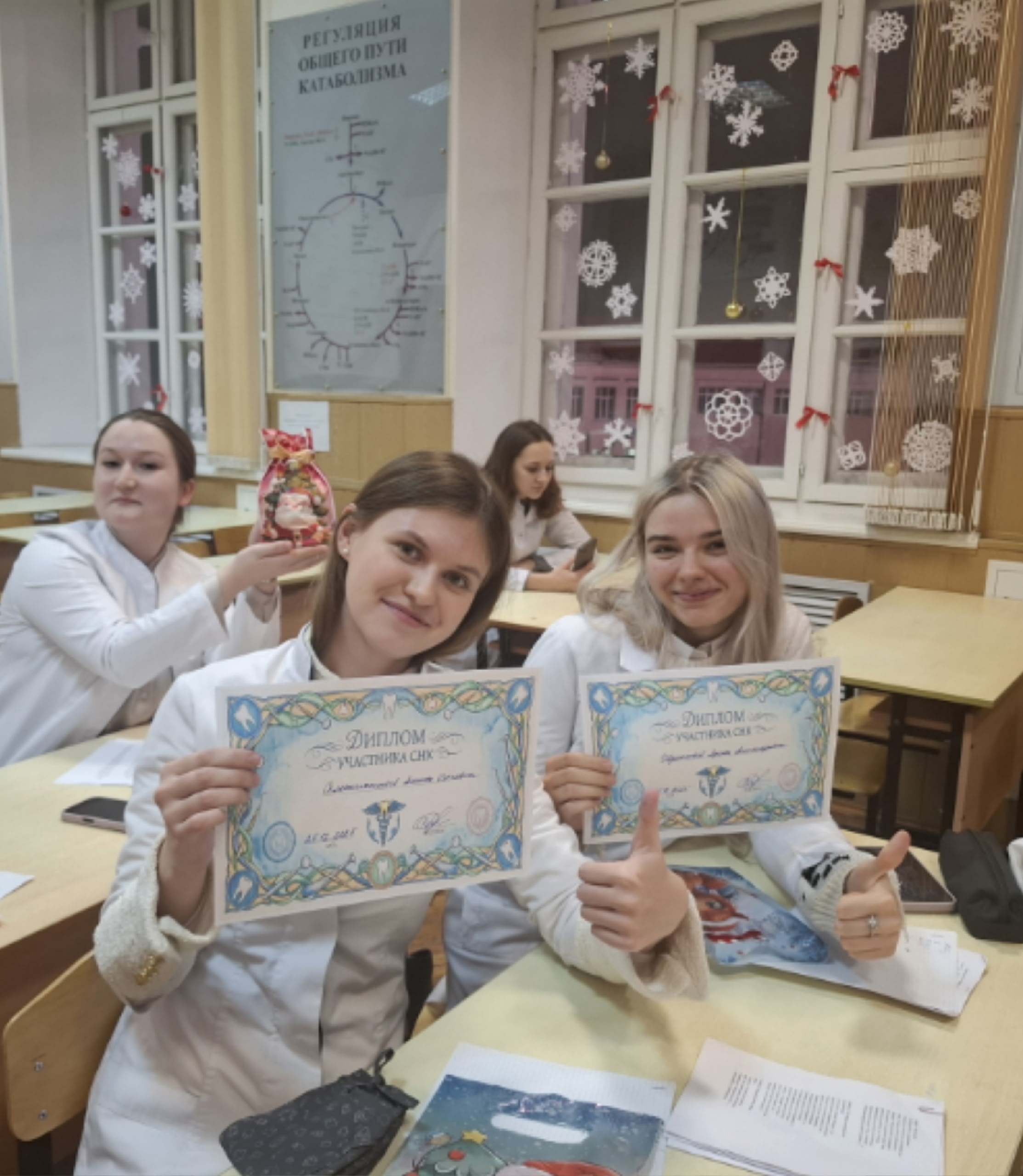 Ольга Николаевна поблагодарила кружковцев за участие, за интересные доклады, и вручила им дипломы участников СНК кафедры биологической химии.