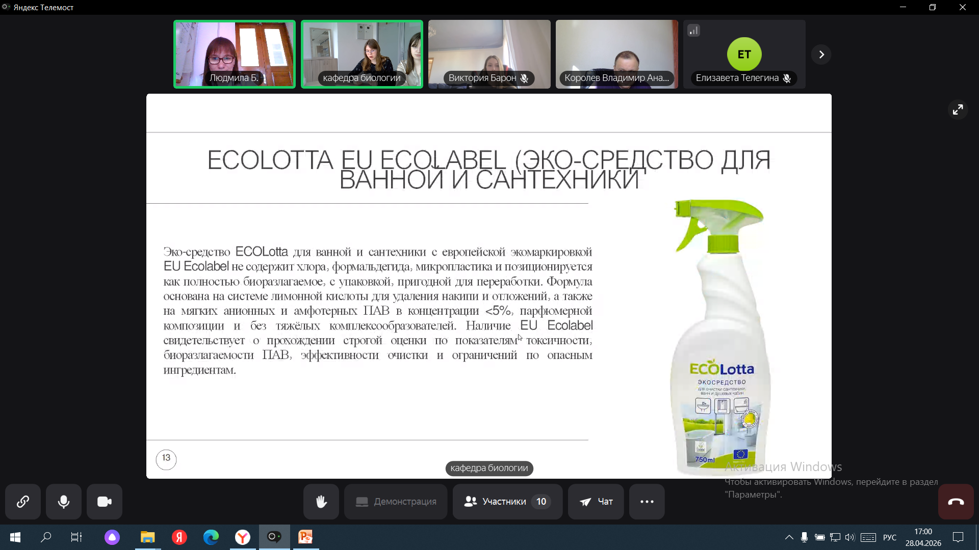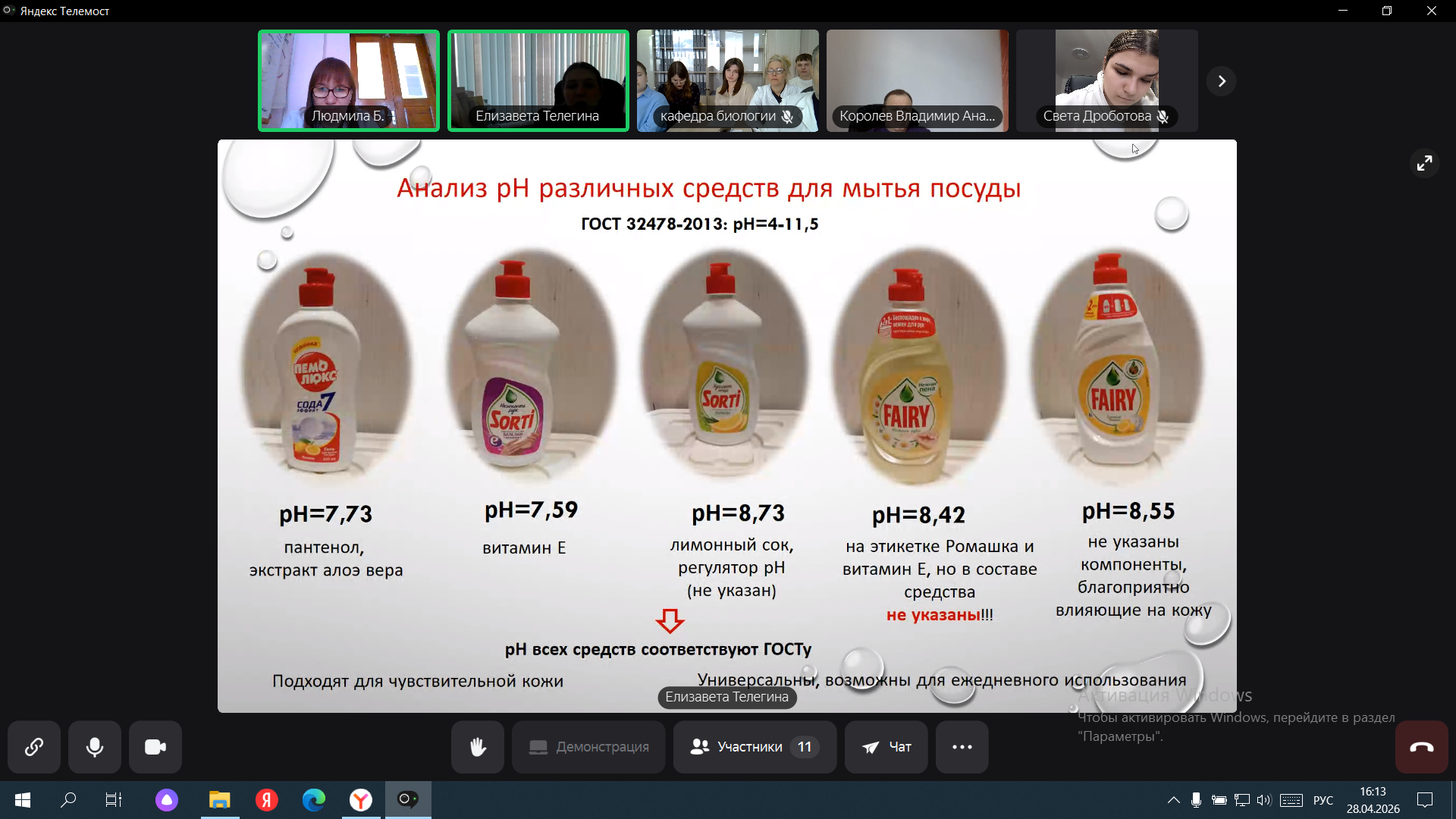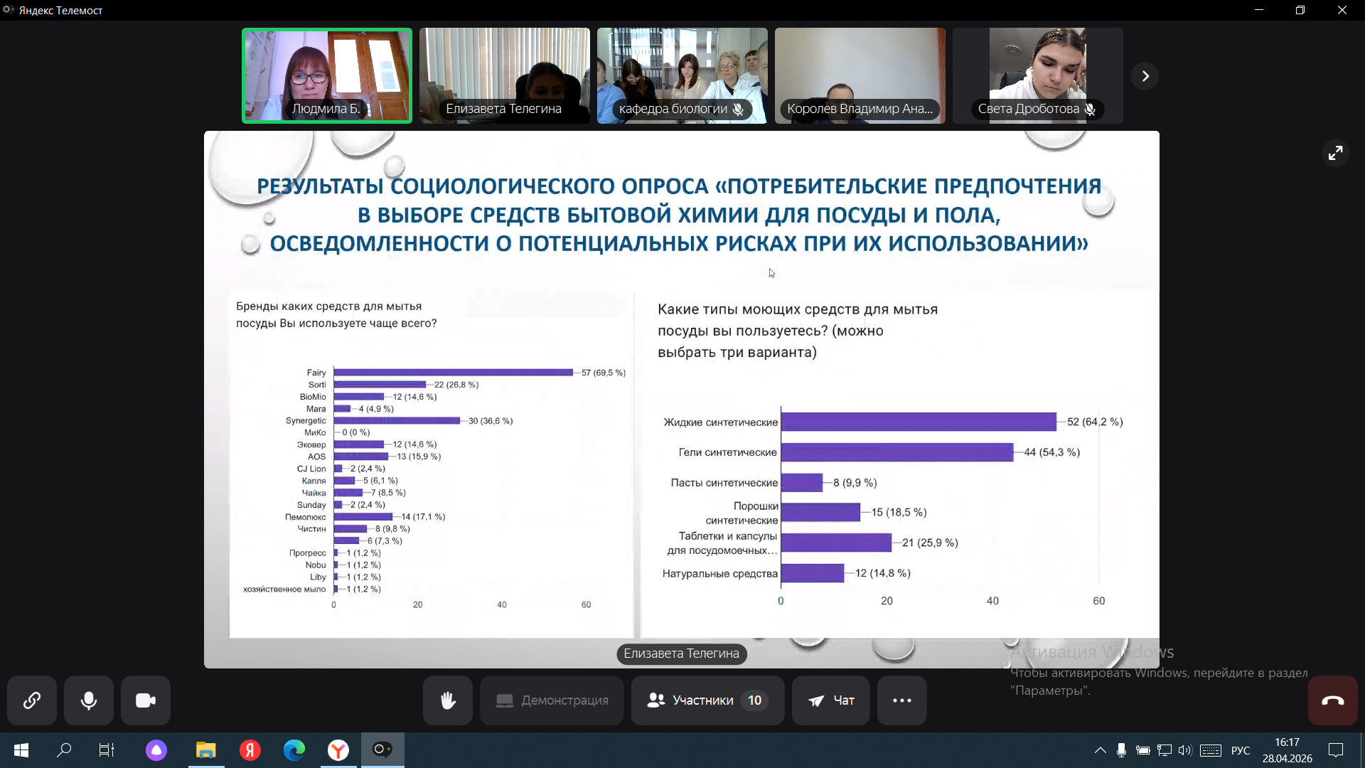 В рамках круглого стола результаты своих исследований, представили члены волонтерского отряда кафедры «ЭкоМед». Телегина Е.А. (рук. зав. кафедрой Королев В.А., доц. Бабкина Л.А.) в своем докладе рассказала о компонентах, входящих в состав средств для мытья посуды и полов, их функциональном назначении, а также об экологических и медицинских рисках их применения. Елизаветой был проанализирован компонентный состав средств для мытья посуды и полов различных брендов и проведено их ранжирование по степени гигиенической и экологической безопасности. В рамках исследования был проведен анализ рН гелей для мытья посуды различных торговых марок и их оценка на соответствие ГОСТу. Было отмечено, что информация, указанная на лицевой стороне, не всегда соответствует действительному составу средства и является лишь маркетинговым ходом. Данный примем может вводить в заблуждение людей и создавать иллюзию безопасности средств для мытья посуды для кожи рук. Сауткина В.П. в своем докладе затронула экологические и медицинские проблемы, возникающие при использовании средств для сантехники и автошампуней. Был проведен сравнительный анализ двух хлорсодержащих средств для сантехники и сделан акцент на какие ключевые компоненты необходимо обращать населению при выборе средств. Внимания заслуживает информация о типах автошампунях, их области применения и потенциальных рисках для почвы и водных экосистем. Проведенный социологический опрос среди населения по данной проблематике показал, что большая часть населения не обладает достаточной компетентностью о безопасности средств для мытья посуды, полов, сантехники, что доказывает актуальность данного мероприятия.