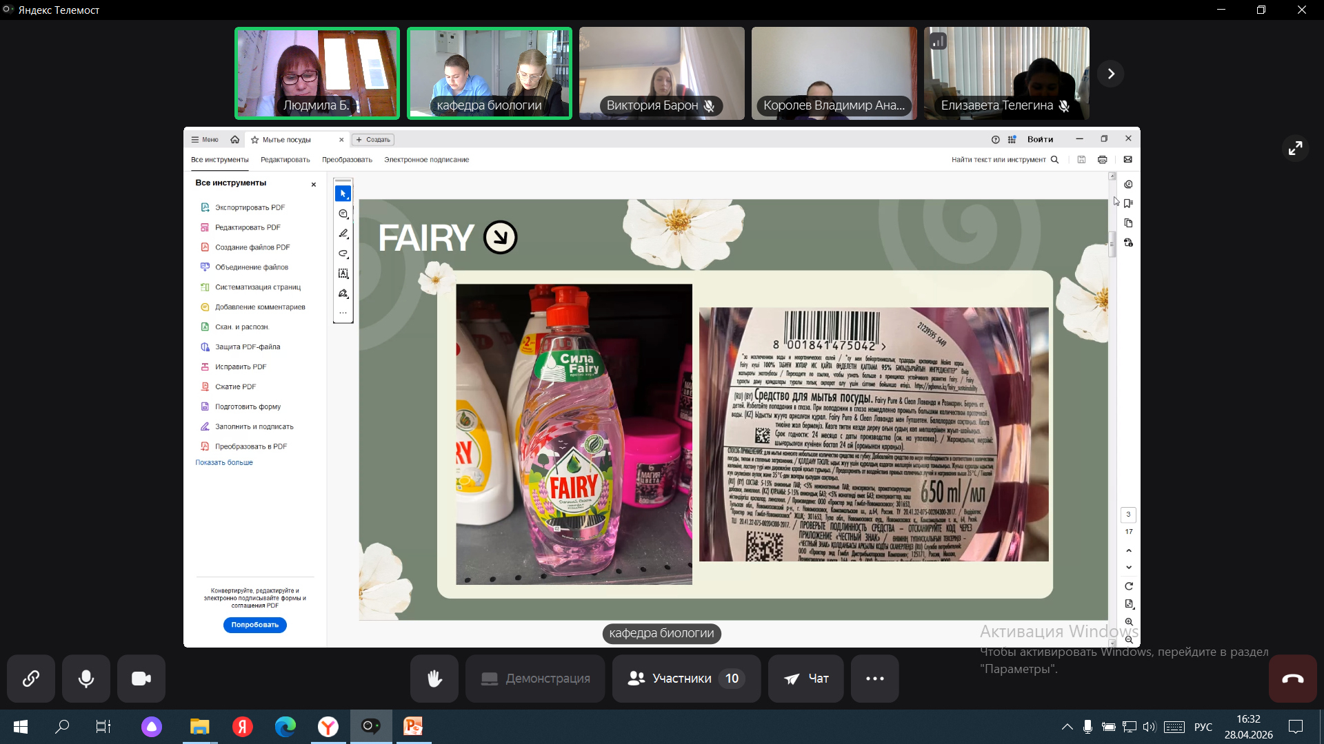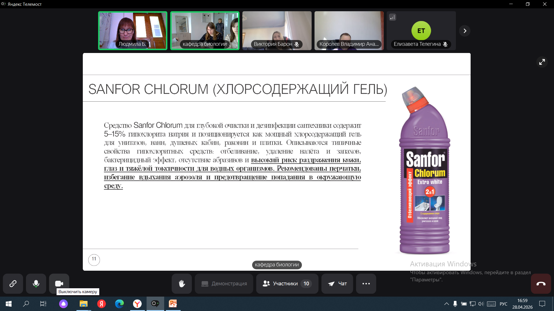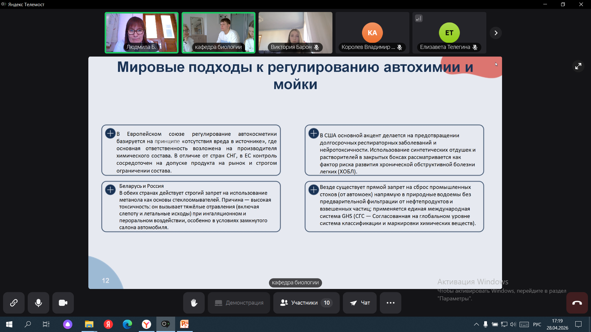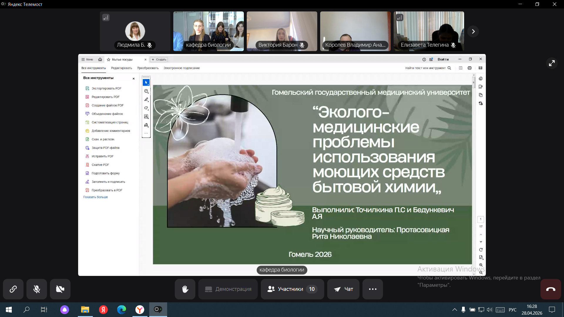 28 апреля 2026 г. в рамках международного научно-образовательного проекта кафедра биологии, медицинской генетики и экологии совместно с кафедрой биологии Гомельского государственного медицинского университета провели круглый стол, посвященный актуальной эколого-медицинской проблеме – безопасному применению моющих средств бытовой химии для посуды, полов, сантехники, автомобилей. Встреча была направлена на оценку потенциального риска компонентов средств бытовой химии указанной группы для здоровья человека и окружающей среды и разработку практических рекомендаций по безопасному использованию этих средств.