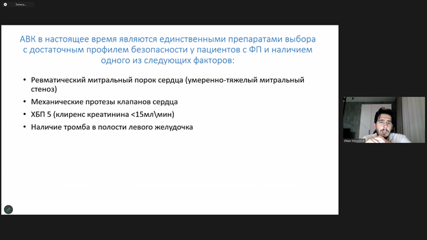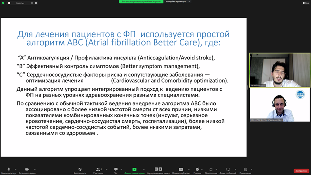 The meeting focused on modern algorithms for antithrombotic pharmacotherapy. Atrial fibrillation was chosen as a model disease. Ivan Alexandrovich Morozov, a student who has been conducting long-term research at the department and is a 6th-year student in the 16th group of the Faculty of Medicine, presented a report on the topic.