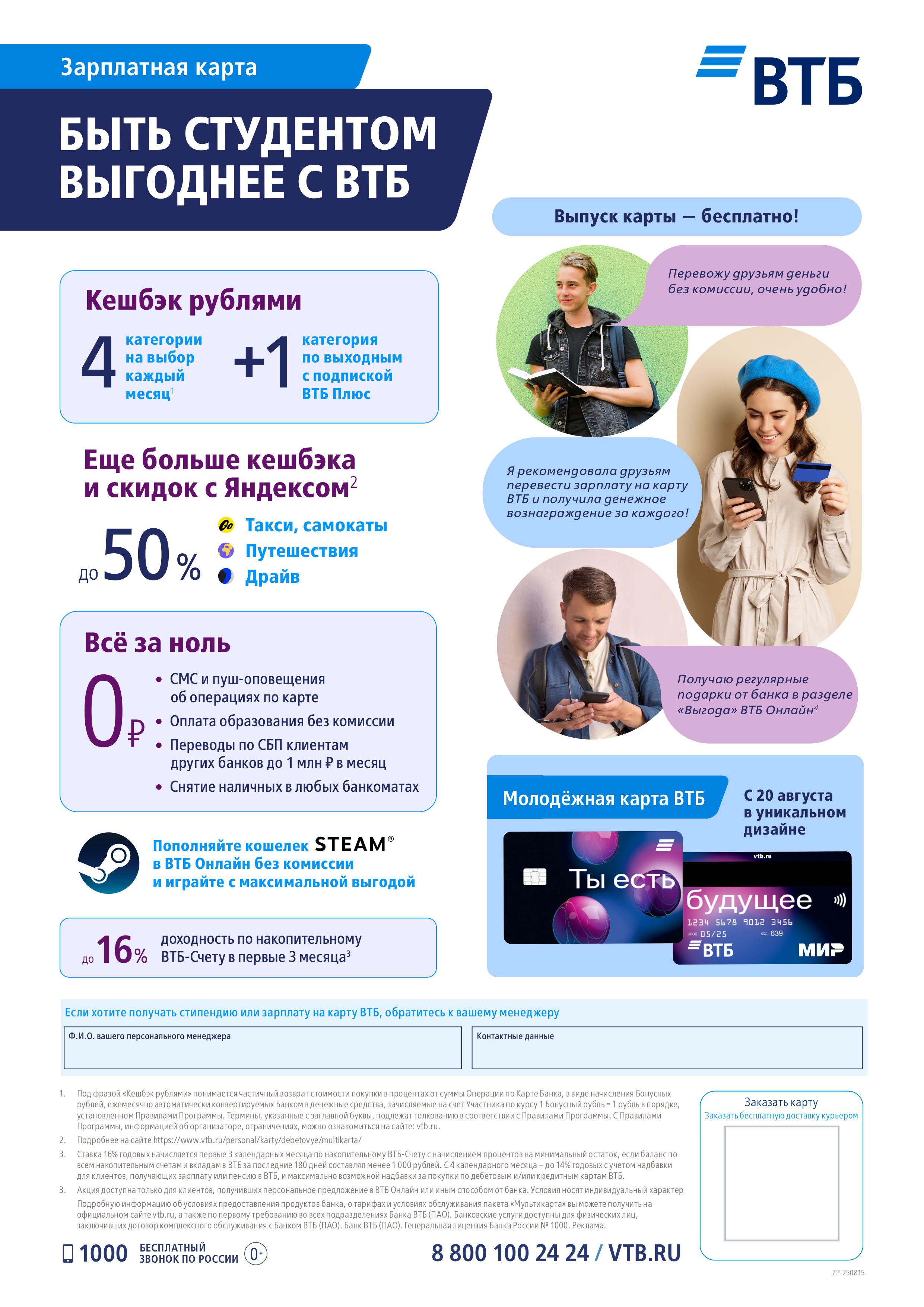- Опция «всё за ноль»: бесплатные СМС, переводы, снятие наличных в любых банкоматах и оплата образования.