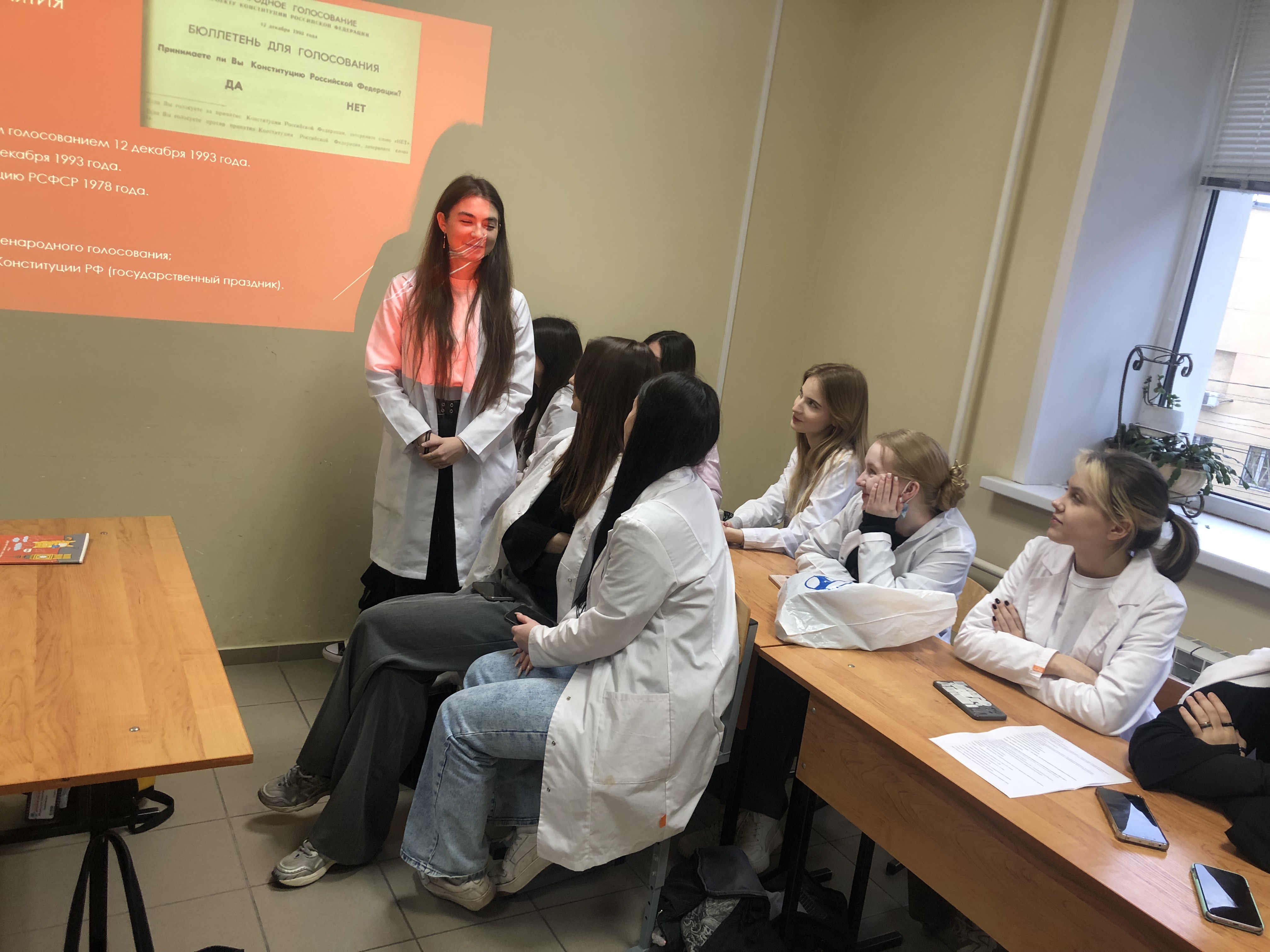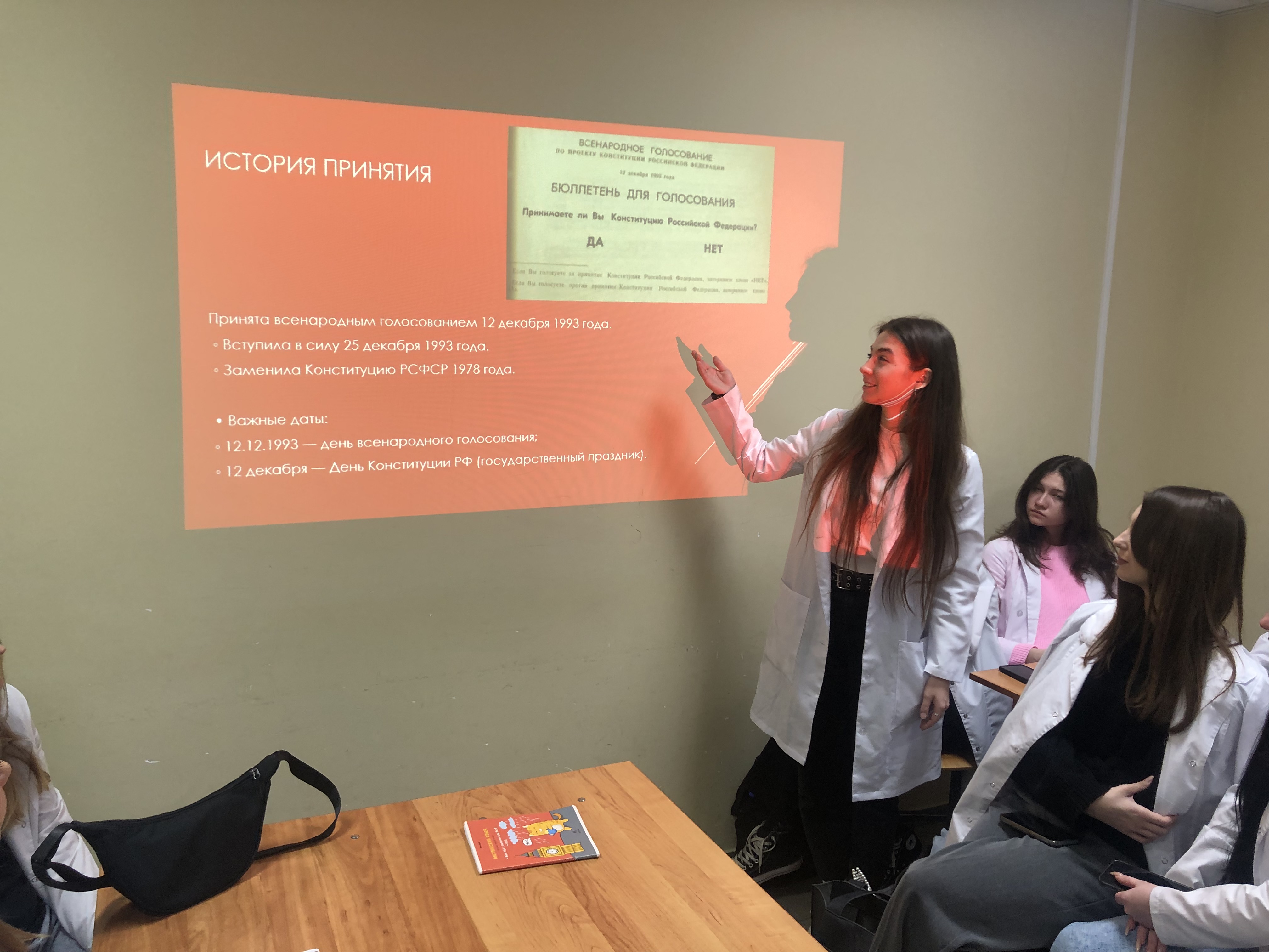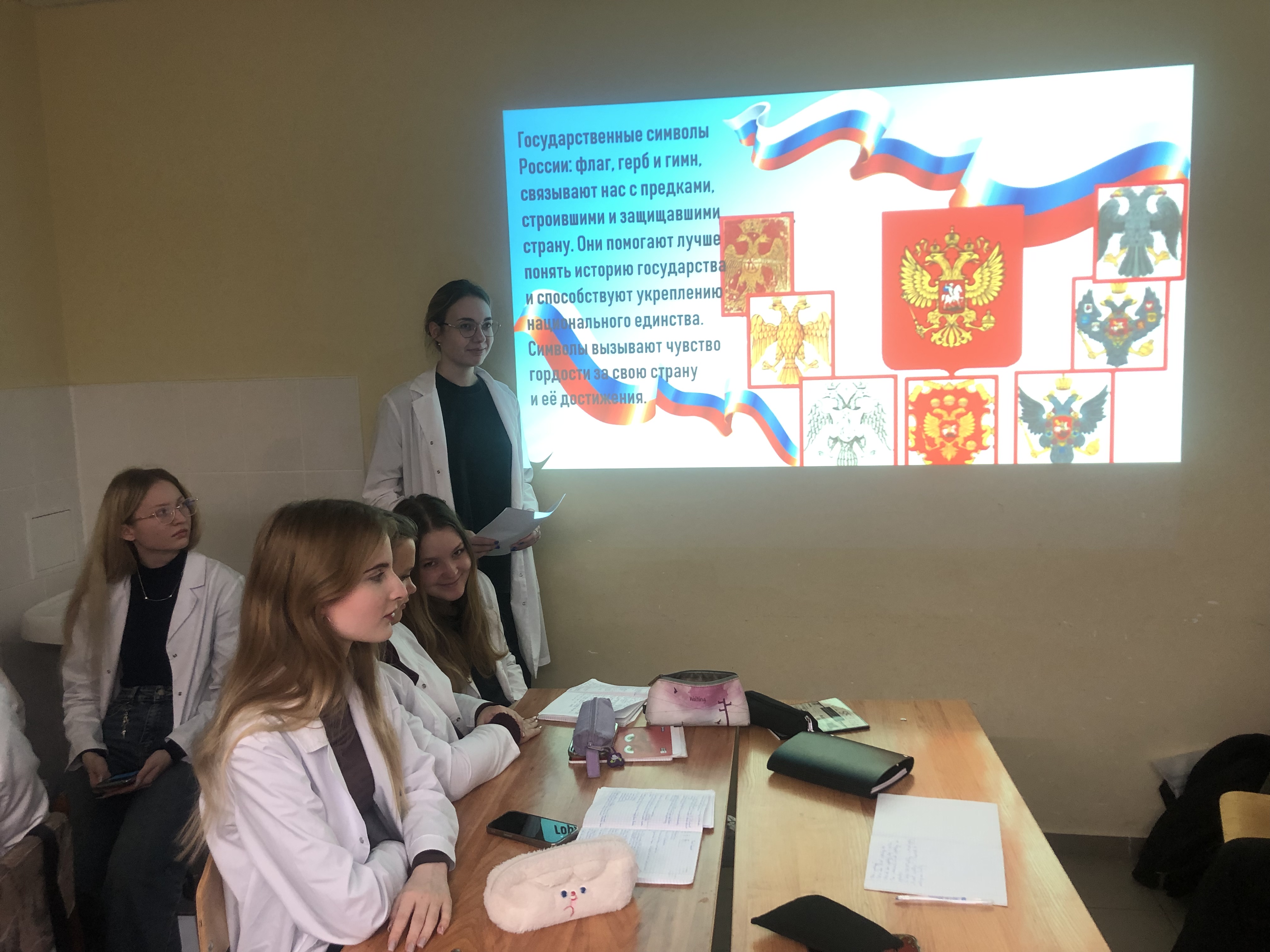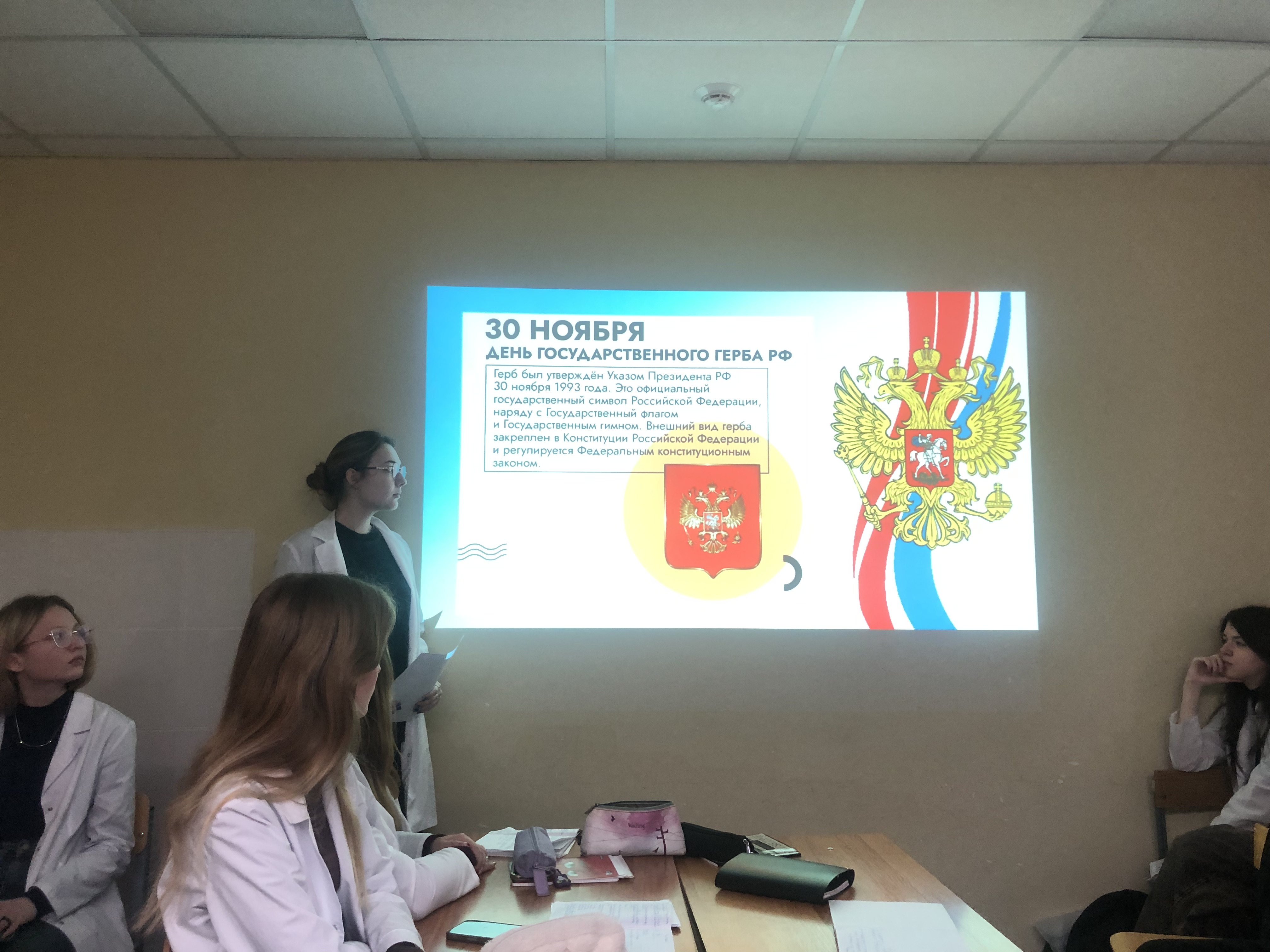 Истории создания и изменений, которые происходили в символике герба Российского государства, была посвящена первая часть проекта «Государственные символы великой страны», организованного студентами 1 группы 1 курса факультета клинической психологии 25 ноября. Презентация Анастасии Сергеевой вызвала большой интерес у студентов, которые узнали некоторые тонкости геральдики. А 9 декабря была представлена вторая часть проекта, посвященная Конституции нашей страны, о которой рассказала Екатерина Веригина.