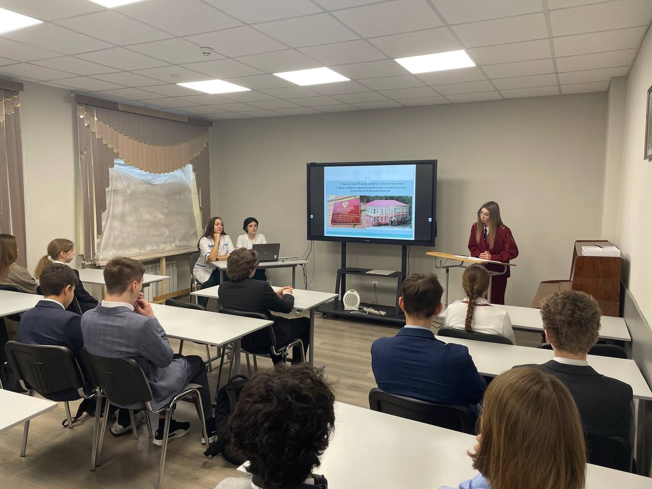 Гости подробно рассказали школьникам о широкой и социально значимой деятельности Федеральной службы по надзору в сфере защиты прав потребителей и благополучия человека (Роспотребнадзор). Речь шла о контроле за санитарно-эпидемиологической обстановкой, защите прав потребителей, организации профилактических мероприятий и обеспечении безопасности среды обитания — от качества пищевой продукции до условий труда и обучения.