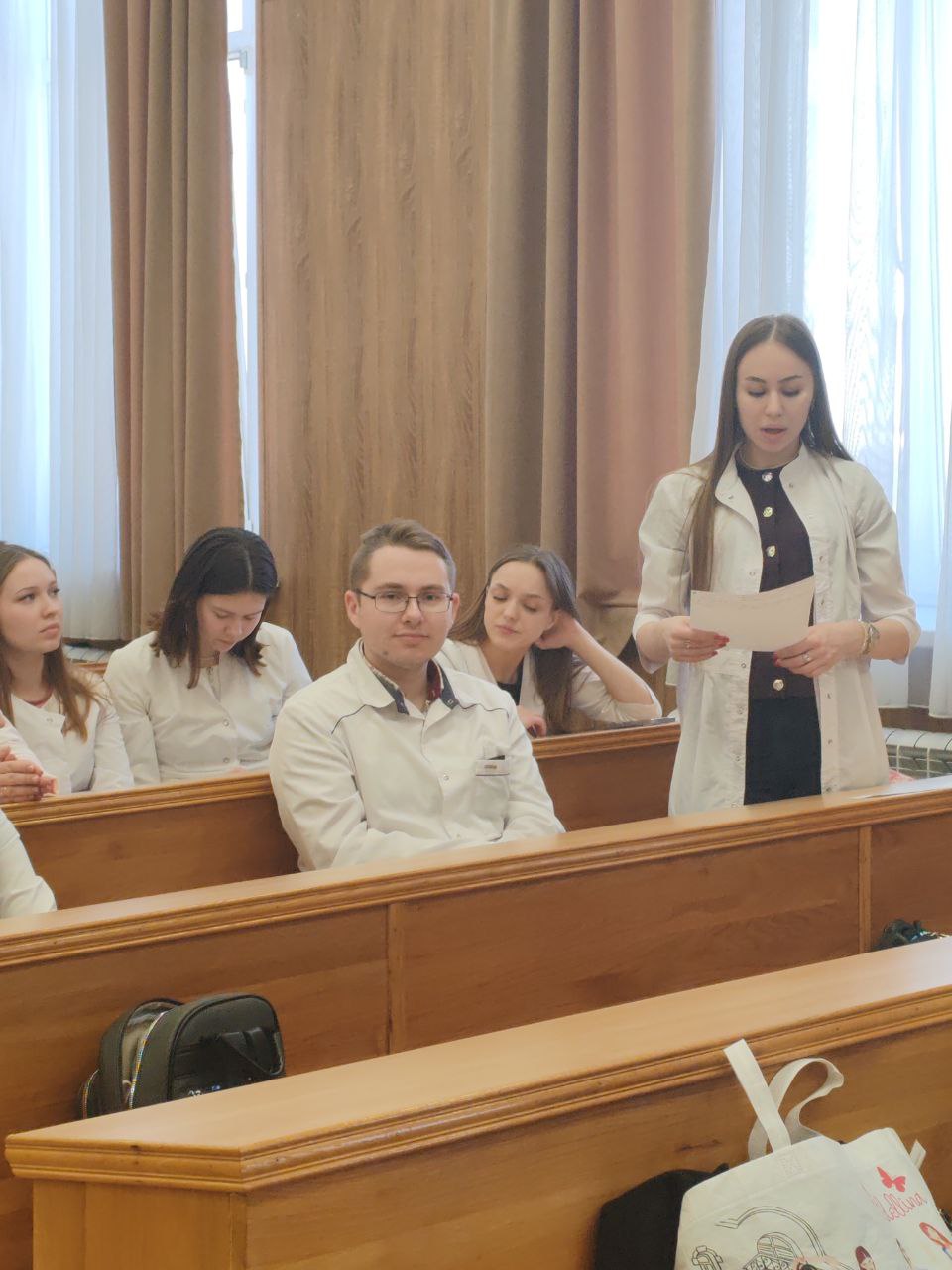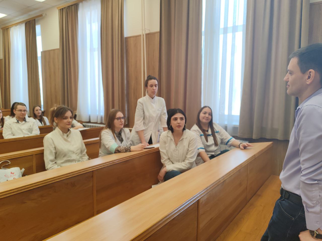 М.В.Быков. Большой практический опыт М.В. Быкова помогли участникам разобрать сложные моменты законодательства о защите прав потребителей.Студенты 6 курса на конкретных примерах показали, как должна строиться работа по консультированию граждан, какие документы необходимо запросить и на какие нормативные документы ссылаться. Первокурсники, в свою очередь, расширили представления о будущей деятельности, получили ценный опыт коммуникации с надзорными органами и узнали, как отстаивать свои права законными методами. Мероприятие прошло в атмосфере живого диалога, стало отличной демонстрацией преемственности знаний на кафедре. Подобные интерактивные занятия способствуют формированию профессиональных компетенций будущих врачей и позволяют на практике отработать взаимодействие надзорного органа и населения.