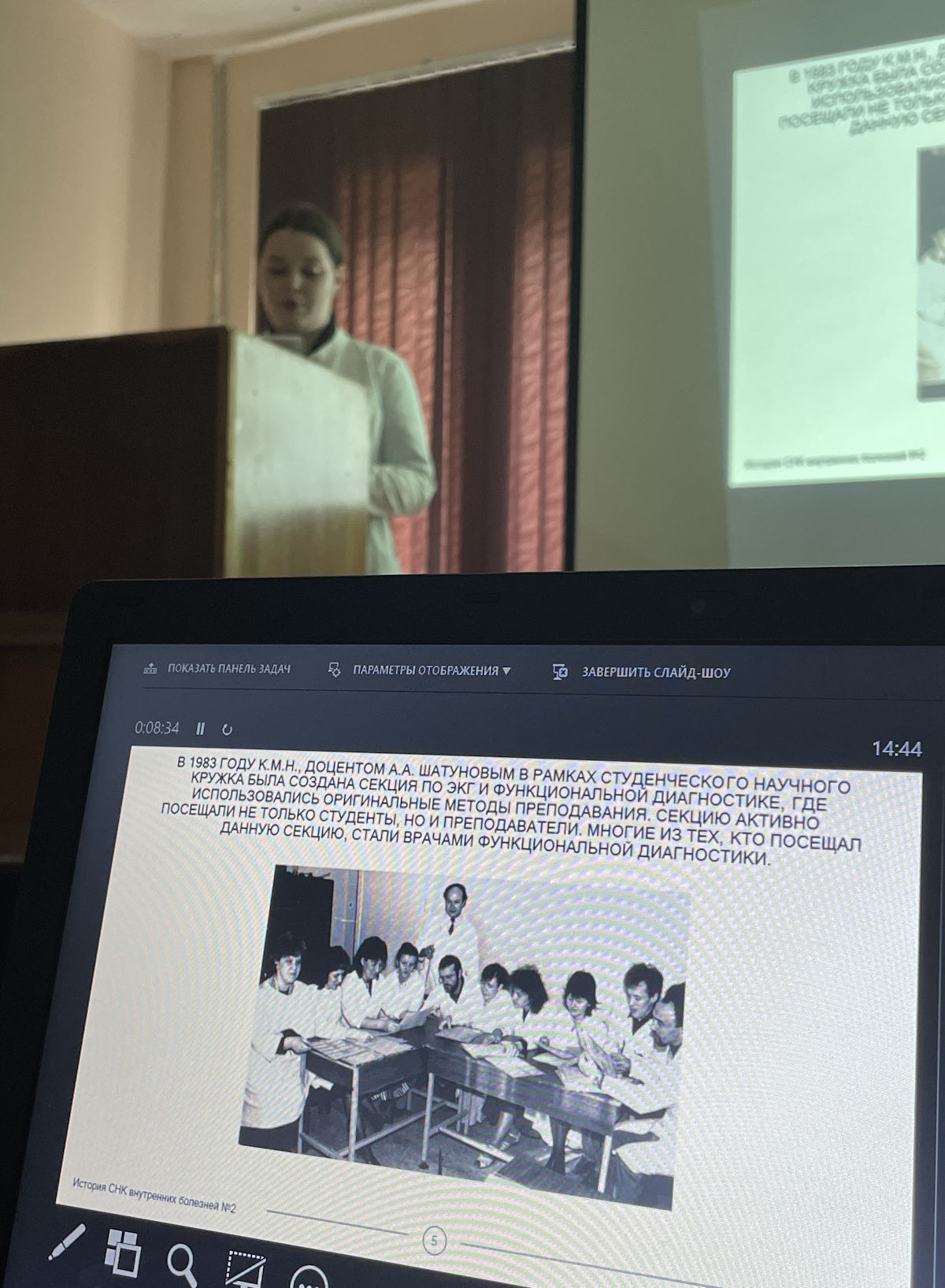 A report on the history of the department and the circle was then presented. Evgeniya Evgenievna Bocharova, the head of the student research circle, spoke about the circle's leaders, the history of its meetings, its scientific achievements, the Faculty Therapy Olympiad, and the current prospects for the development of the student research circle.