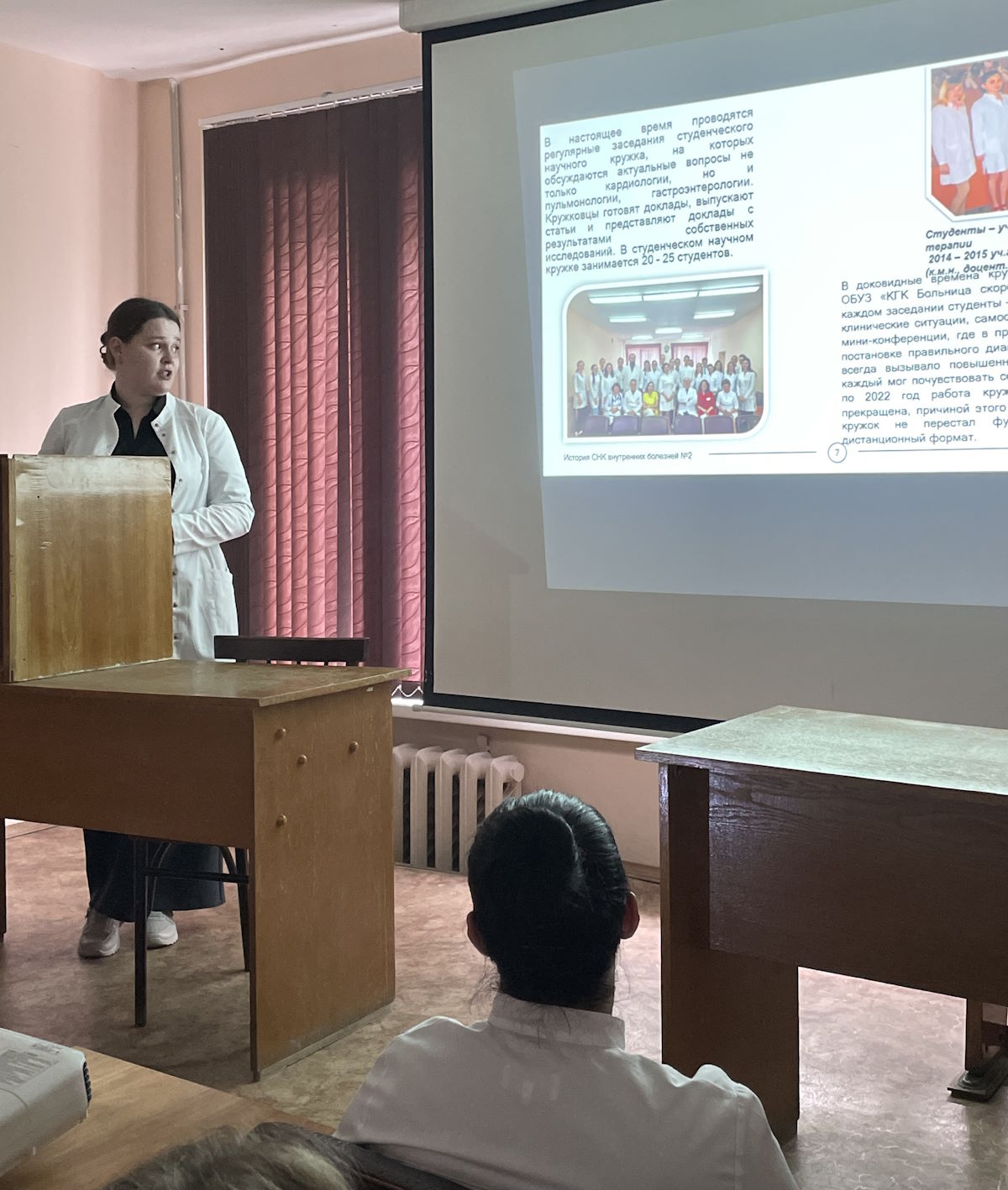 Далее прозвучал доклад об истории кафедры и кружка. Староста СНК Бочарова Евгения Евгеньевна рассказала о руководителях кружка, об истории заседаний, научных достижениях, олимпиаде по факультетской терапии и современных перспективах развития студенческого научного кружка.