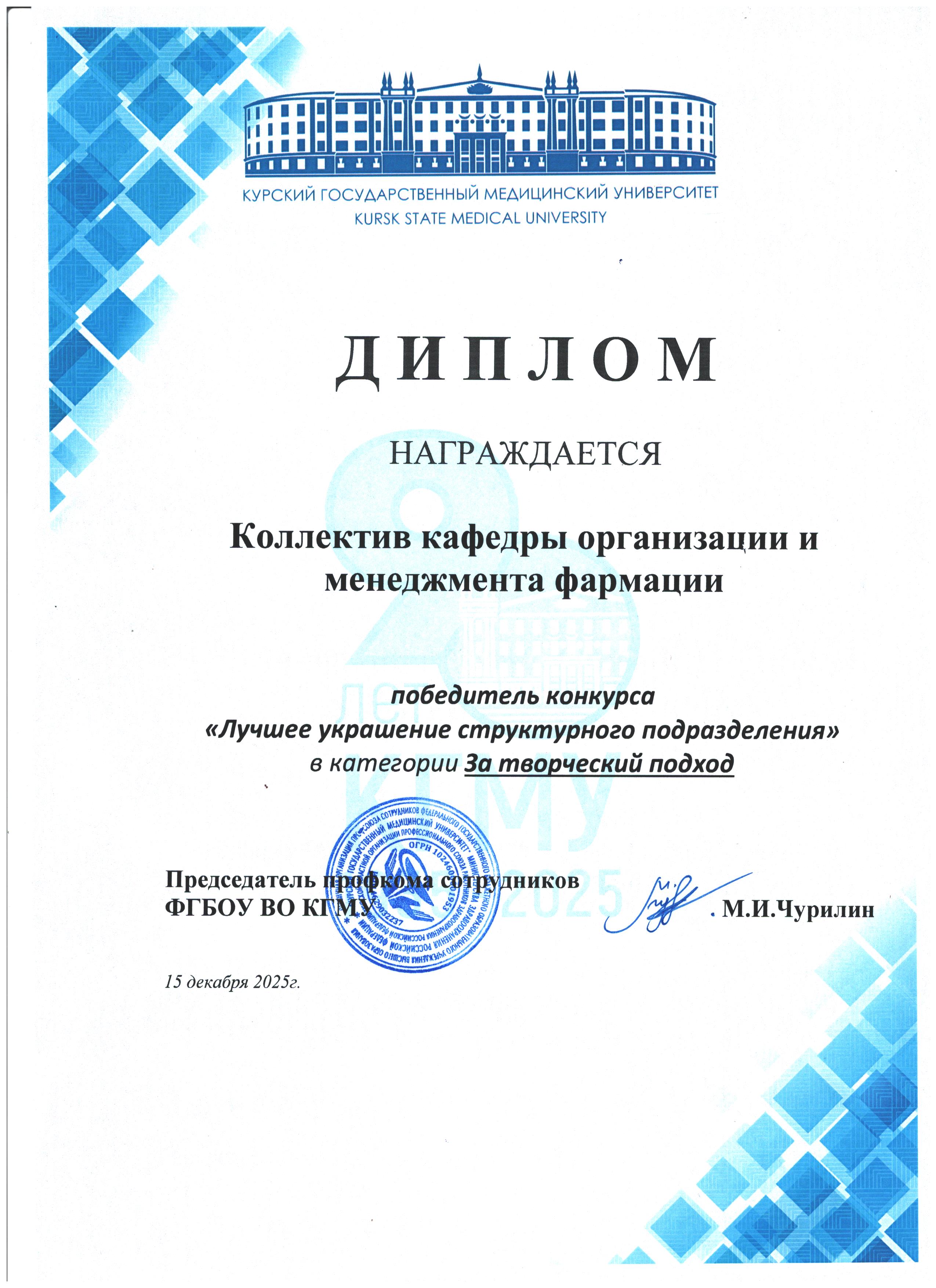 Кафедра организации и менеджмента фармации - дипломант конкурса на лучшее новогоднее оформление структурных подразделений!