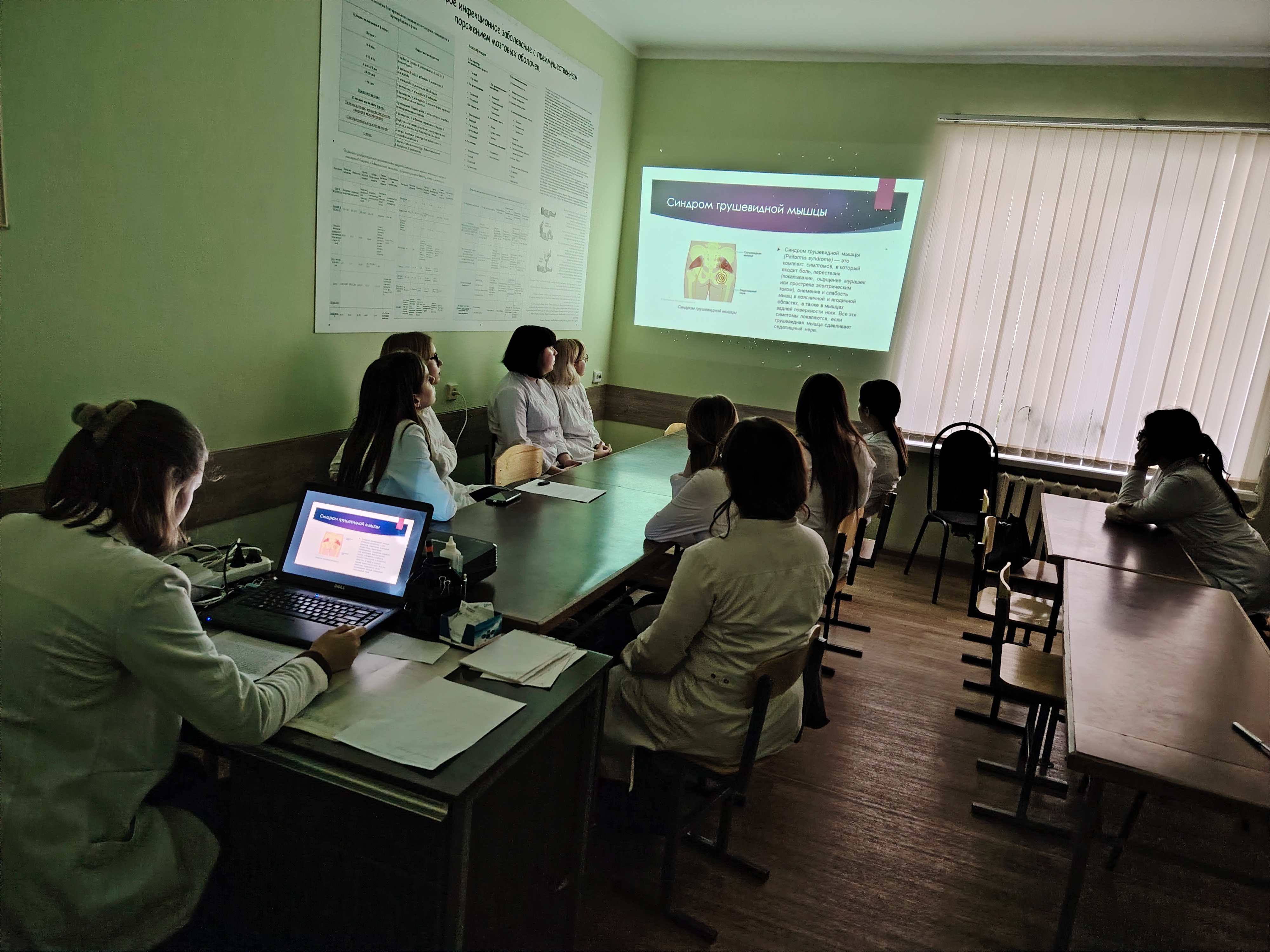 23.10.2025 г на базе кафедры неврологии состоялось второе заседание СНК, тема которого: «Остеохондроз: патогенез, ведущие клинические синдромы, подходы к диагностике и лечению. Рефлекторные синдромы: синдром грушевидной мышцы. Скаленус синдром.» С кружковцами рассмотрели наиболее часто встречающиеся рефлекторные мышечные синдромы, обозначили ключевые аспекты патогенеза таких состояний как скаленус-синдром, синдром грушевидной мышцы. Провели клинический разбор двух пациентов с рассеянным склерозом, имеющих множественную очаговую симптоматику в виде гиперкинеза, центральны парезов, поражения глазодвигательных нервов, мозжечковой симптоматикой, ретробульбарным невритом.